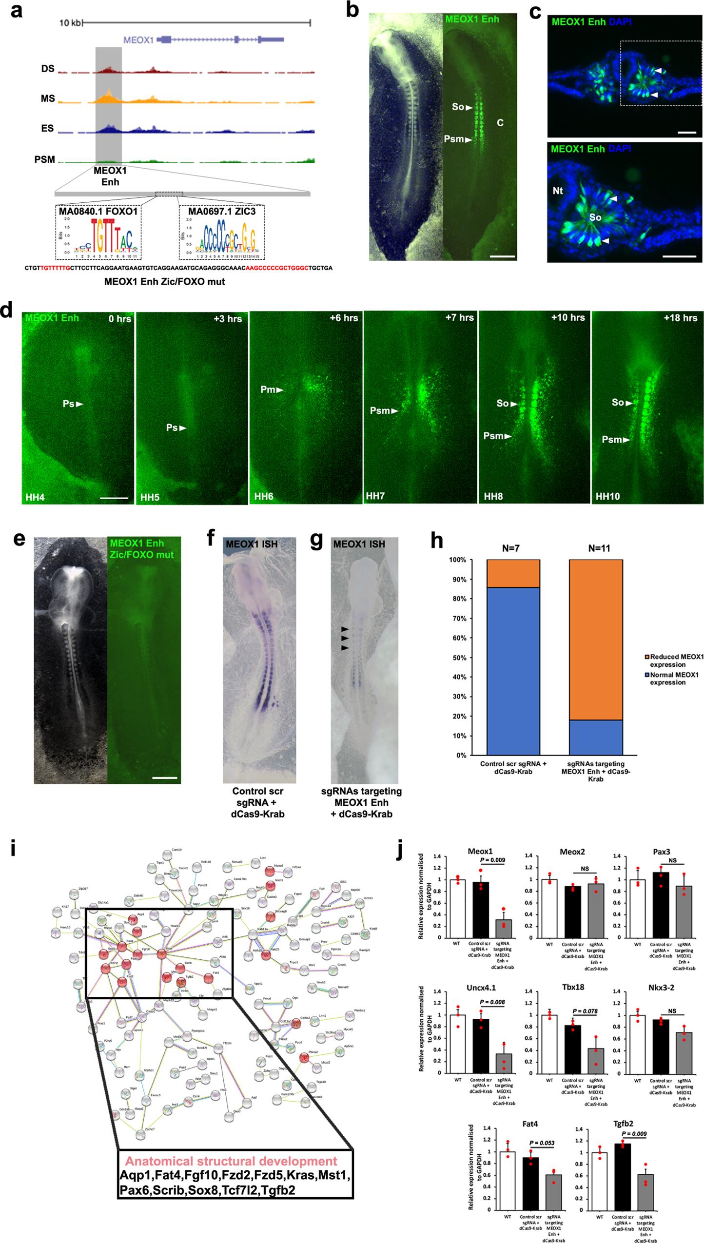 Fig. 6: Identification of a regulatory element for MEOX1. a ATAC-seq profile at MEOX1 locus. Grey box indicates putative enhancer identified. FOXO1 and ZIC3 footprints identified within enhancer element. Mutant reporter sequence for MEOX1 Enh ZIC/FOXO mutant. b MEOX1 Enh reporter expression in presomitic mesoderm (Psm) and in somites (So) (nâ=â13/13). c Transverse sections of embryo in b immunostained for Citrine showing MEOX1 Enh expression in epithelial somites, white dashed line in b indicates location of section, representative of (nâ=â4/4). Nuclei stained with DAPI (blue). d Still photographs from a time-lapse movie of MEOX1 Enh with the primitive streak (Ps) indicated. Fluorescent activity first observed in prospective paraxial mesoderm (Pm) at HH6 and continuous expression in the presomitic mesoderm (Psm) at HH7 prior to expression in somites (So) at HH8 and HH10 (nâ=â3/3). e FOXO1 and ZIC3 binding site mutation in MEOX1 Enh Citrine reporter led to loss of expression (nâ=â6/7). Epigenome engineering using dCas9-Krab with (f) control scrambled sgRNAs resulted in no change (nâ=â6/7) and (g) sgRNAs targeting endogenous FOXO1 and ZIC3 binding sites led to loss of MEOX1 expression (nâ=â9/11) as shown by wholemount in situ hybridisation. h Percentage of embryos with normal (blue) or reduced (orange) MEOX1 expression after injection and electroporation of control scrambled sgRNA with dCas9-Krab or sgRNAs targeting MEOX1 Enh FOXO1 and ZIC3 binding sites with dCas9-Krab. i Proteinâprotein network analysis using STRING database. Interactions between genes identified with MEOX1 footprints in an accessible region, within 10âkb upstream or downstream. Highlighted in red are genes correlated with anatomical structural development based on GO analysis. j RT-qPCR on somites dissected from wild-type (WT) embryos, or embryos electroporated with control scrambled sgRNA and dCas9-Krab, or sgRNAs targeting MEOX1 Enh FOXO1 and ZIC3 binding sites with dCas9-Krab. Statistical significance was determined by a two-tailed Studentâs t test. **pâ=â0.001â0.01; *pâ=â0.01â0.1; ns not significant. All scale barsâ=â500âμm except for c scale barâ=â100âμm. |