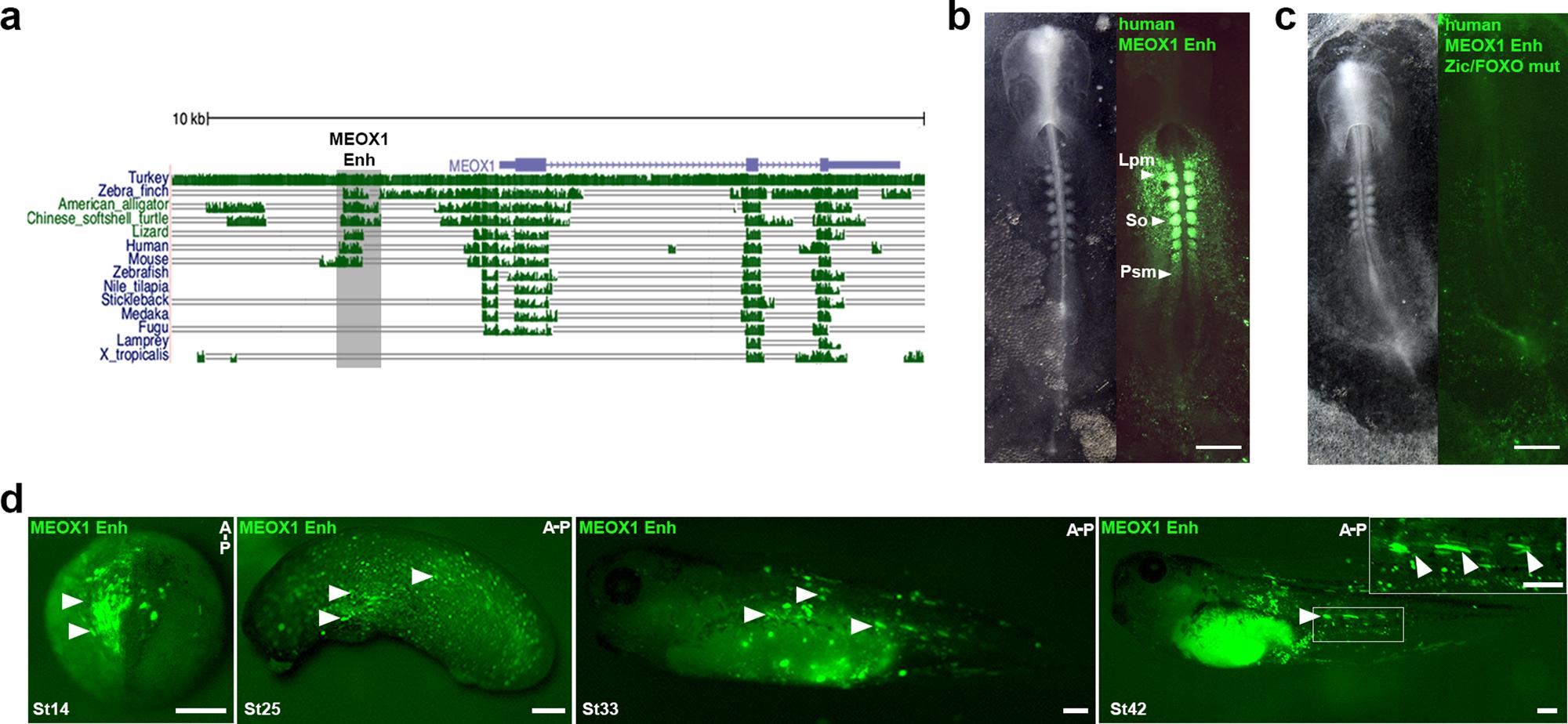 Fig. 7: Evolutionary conservation of MEOX1 enhancer and regulatory mechanism across vertebrates. a Genomic alignment of chick MEOX1 locus, ~10âkb. Exons and introns are represented by blue boxes and lines. Clustered green vertical lines indicate sequence identity between different species. The height of bars indicates extent of conservation in different species: turkey, zebra finch, American alligator, Chinese softshell turtle, Lizard, Human, Mouse, Zebrafish, Nile tilapia, Stickleback, Medaka, Fugu, Lamprey and Xenopus tropicalis, as indicated on the left of each row. Grey shading indicates the location of the MEOX1 Enh. b Expression of the conserved human MEOX1 Enh reporter in presomitic mesoderm, somites and lateral plate mesoderm in a HH9 chick embryo (nâ=â6/6). c Mutation of FOXO1 and ZIC3 binding sites in the human MEOX1 Enh Citrine reporter led to loss of expression (nâ=â4/4). d Chick MEOX1 Enh reporter injected into 1 cell of a Xenopus laevis 2-cell embryo shows Citrine expression in paraxial mesoderm (St14, white arrowheads (nâ=â6/6)) and in early somites and elongated myofibres (St25 (nâ=â6/6), St33 (nâ=â6/6), St42 (nâ=â6/6), white arrowheads). A-P anteriorâposterior. Scale bars for b, c =â500âμm, d scale barâ=â250âμm. |