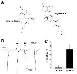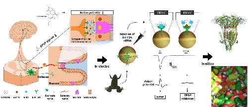 Figure 1. Chemical structure of chanoclavine and ergonovine and the inhibitory effects on Xenopus oocytes expressing human 5-hydroxytryptamine (5-HT)3A receptors. (A). Structure of chanoclavine (EC) and ergonovine (EG). (B). After flowing 5-HT mixed with bath solution for one minute per 2 mL, 5-HT (100 µM) induced a reversible inward current (I5-HT). The traces indicate the inward current in the presence of 5-HT coapplied with ergonovine and chanoclavine at 100 µM. The representative traces from four different frogs elicited at the −80-mV holding potential. (C). The histogram indicates that the percentage of inhibition by chanoclavine was 42.5 ± 9.7 calculated from the mean of the peak inward current. Each value represents the mean ± S.E.M (n = 8–10 from four different frogs). |