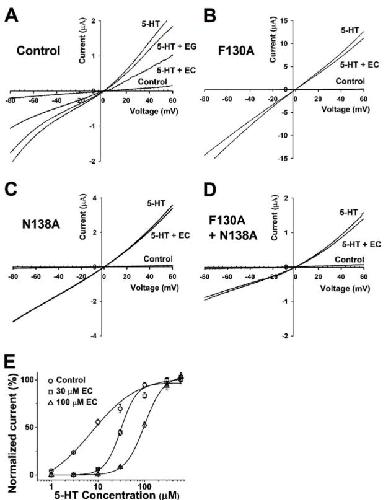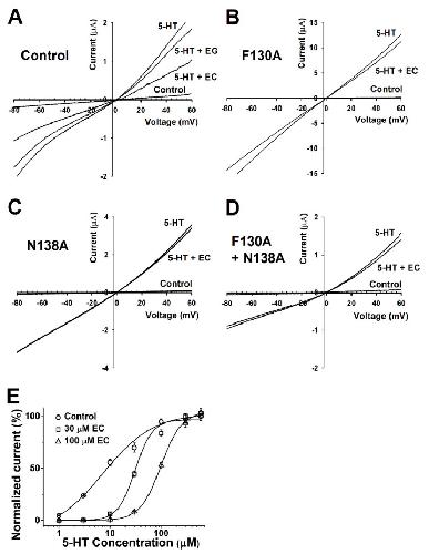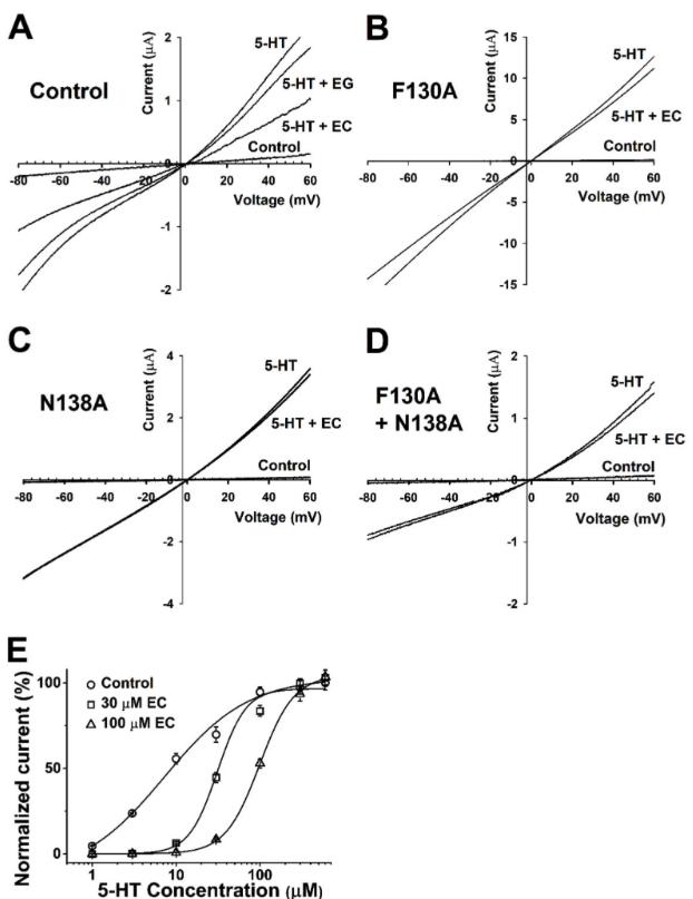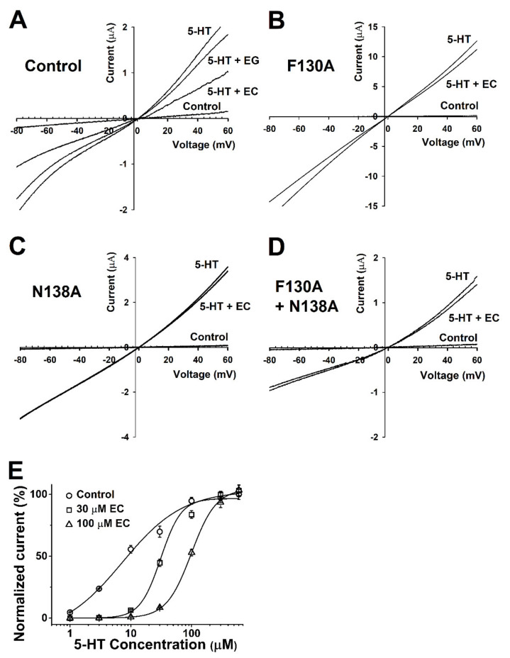 Figure 4. Voltage dependency and competition inhibition of chanoclavine in I5-HT in oocytes expressing 5-HT3A receptors. (A–D). Current–voltage relationship of I5-HT inhibition by chanoclavine in 5-HT3A receptors. Wild-type 5-HT3A receptor traces showed a current–voltage relationship with EC and EG at the same concentration as 5-HT (100 µM). All control trace voltage ramps change with only the bath solution flowing without treatment. Traces were obtained using voltage changes from −80 mV to +60 mV over a duration of one sweep per two seconds. B–D Indicate F130A, N138A, and F130A+N138A, respectively. (E). Concentration-response effect of 5-HT in the absence or presence of chanoclavine on oocytes expressing human 5-HT3A receptors. Control (○) represents various 5-HT concentration currents from 1 to 100 µM in the absence of chanoclavine, and 5-HT at 30 µM (□) and 100 µM (△) chanoclavine represents the change in the current compared to the control. Normalized currents were divided by the Imax of the control current and the Imax of 5-HT alone, with 30 µM and 100 µM EC at 99.1 ± 14.2, 94.6 ± 24.4, and 60 ± 2.2, respectively. Oocytes were exposed to 5-HT alone or with EC over a duration of 2 mL per minute and held at a −80 mV membrane holding potential. Each value represents the mean ± SEM (n = 8–10 from four different frogs). |