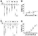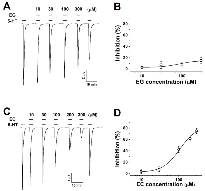 Figure 2. The concentration-dependent response of Xenopus oocytes expressing human 5-HT3A receptors to ergot alkaloids. (A). The traces represent increases in the current inhibition with increases in the ergonovine concentration. Treatment with 5-HT (100 µM) alone induced an inward current followed by various response traces with 5-HT (100 µM) and ergonovine (10, 30, 100, and 300 µM). (B). The plot shows the ergonovine inhibition current fitted according to Hill’s equation, where the maximum inhibition (Imax) was 15 ± 5.7%. (C). The traces induced by chanoclavine with 5-HT (100 µM) appear dependent upon the concentration (10, 30, 100, and 300 µM). (D). Average percentage curves of chanoclavine fitted according to Hill’s equation based on the peak of the inward current. The Imax was 83.6 ± 12.6%, and the inhibition was 4 ± 3.8%, 7.9 ± 4.1%, 42.5 ± 5.7%, 61.6 ± 6.1%, and 75 ± 4.5% at 10, 30, 100, 200, and 300 µM, respectively. The oocytes expressing human 5-HT3A mRNA were held at −80 mV, and each value represents the mean ± SEM (n = 8–10 from four different frogs). |