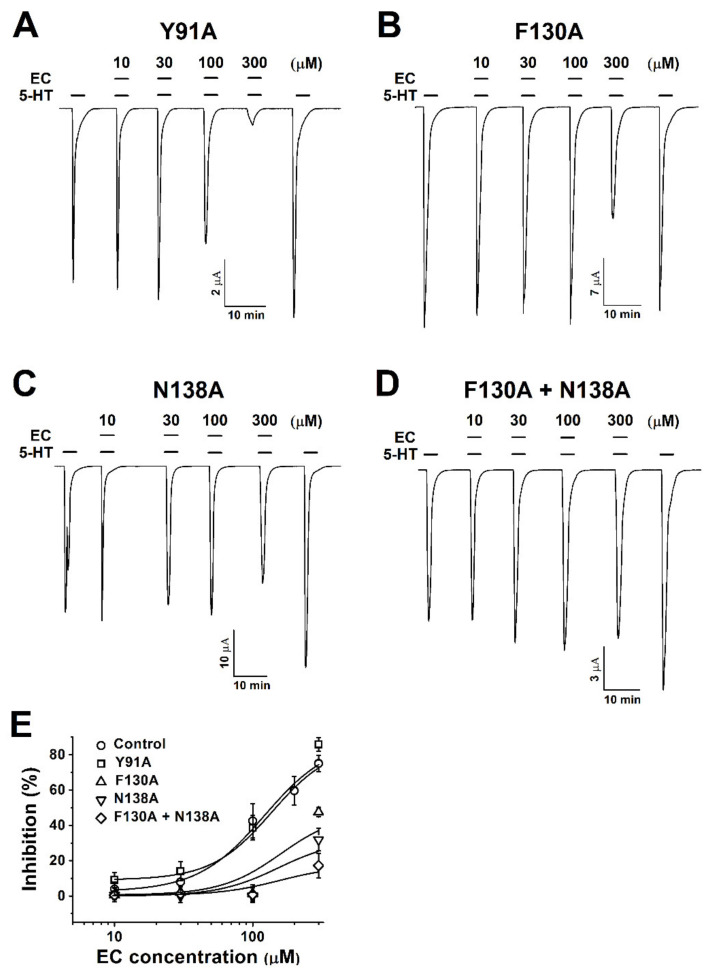 Figure 3. Concentration-dependent inhibition responses of mutants to chanoclavine. (A–D). Y91A, F130A, N138A, and F130A+N138A mutant receptors are rectified at a −80 mV holding potential. The 5-HT3A mutant receptors expressed in Xenopus oocytes elicit reversible currents using an electrode voltage clamp. All oocytes were exposed to 10, 30, 100, and 300 µM chanoclavine coapplied with 100 µM 5-HT after treatment with 5-HT alone. (E). The inhibition percentage curve according to the EC concentration of the 5-HT3A mutant receptors. Each value represents the mean ± SEM. Additional half-maximal inhibitory response concentrations (IC50), Imax, and Hill’s coefficient values of the other mutants are listed in Table 1 (n = 6–8 from four different frogs). |
