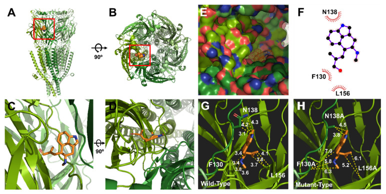 Figure 5. Molecular docking modeling of chanoclavine to the 5-HT3A receptor. (A–D). Side and top views of the chanoclavine docking model to the 5-HT3A receptor. (E). Binding pocket in the 5-HT3A receptor region of the extracellular domain membrane of the pocket side. Chanoclavine docked to the extracellular region that forms a loop complex in the 5-HT3A receptor. (F). 2D schematic of the predicted binding mode of chanoclavine in the ligand-binding pocket. (G,H). Binding interactions of the ligand and residues in the wild and mutant types. The replaced mutants changed the interaction activity to varying degrees. |