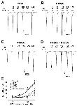 The concentration-dependent response of Xenopus oocytes expressing human 5-HT3A receptors to ergot alkaloids. (A). The traces represent increases in the current inhibition with increases in the ergonovine concentration. Treatment with 5-HT (100 µM) alone induced an inward current followed by various response traces with 5-HT (100 µM) and ergonovine (10, 30, 100, and 300 µM). (B). The plot shows the ergonovine inhibition current fitted according to Hill’s equation, where the maximum inhibition (Imax) was 15 ± 5.7%. (C). The traces induced by chanoclavine with 5-HT (100 µM) appear dependent upon the concentration (10, 30, 100, and 300 µM). (D). Average percentage curves of chanoclavine fitted according to Hill’s equation based on the peak of the inward current. The Imax was 83.6 ± 12.6%, and the inhibition was 4 ± 3.8%, 7.9 ± 4.1%, 42.5 ± 5.7%, 61.6 ± 6.1%, and 75 ± 4.5% at 10, 30, 100, 200, and 300 µM, respectively. The oocytes expressing human 5-HT3A mRNA were held at −80 mV, and each value represents the mean ± SEM (n = 8–10 from four different frogs). |