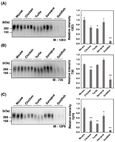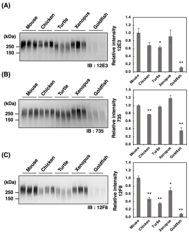Figure 3. Native-PAGE/Western blotting of polySia-NCAM in brains from five different vertebrates. Brains from five vertebrates (mouse, chicken, turtle, xenopus, goldfish, n = 3) were used. PolySia expression was analyzed using native-PAGE/Western blotting. The brain homogenates of five vertebrate brains were separated by native-PAGE (7% polyacrylamide gel) and blotted onto PVDF membranes (10 µg as protein/lane). The polySia-NCAM was visualized using anti-polySia antibodies, (A) 12E3, (B) 735, and (C) 12F8. The left panel represents the immunoblots. The right panel shows the relative intensity of the polySia antibody. Mouse staining was set to 1.0. * indicates p < 0.05. ** indicates p < 0.01. |