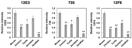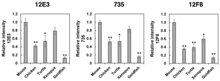 Figure 5. ELISA analysis of polySia-NCAM in brains from five different vertebrates. Brain homogenates (250 ng as protein) from five vertebrates (mouse, chicken, turtle, xenopus, goldfish, n = 3) were immobilized onto a 96-well plate and blocked with 2% BSA. The wells were then incubated with 12E3, 735, or 12F8 antibody before or after the Endo-N treatments. After color development, ELISA values of the Endo-N-treated wells were subtracted from those of the Endo-N-untreated wells. The left, middle, and right panels show the relative binding intensity of the 12E3, 735, and 12F8 antibodies, respectively. Triplicate analyses are shown with error bars. * indicates p < 0.05. ** indicates p < 0.01. |
