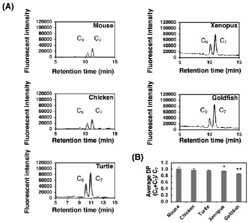 Figure 7. Fluorometric C7/C9 analysis of brain homogenates of five different vertebrate brains. Brains from five vertebrates (mouse, chicken, turtle, xenopus, and goldfish, n = 3) were used. Brain homogenates (20 µg as protein) were subjected to the fluorometric C7/C9 method to measure the average degree of polymerization (DP). (A) Typical chromatograms of C7/C9 analysis of each brain. (B) Relative (C7+C9)/C7 index in each brain. * indicates p < 0.05. ** indicates p < 0.01. Mouse value was set to 1.0. |