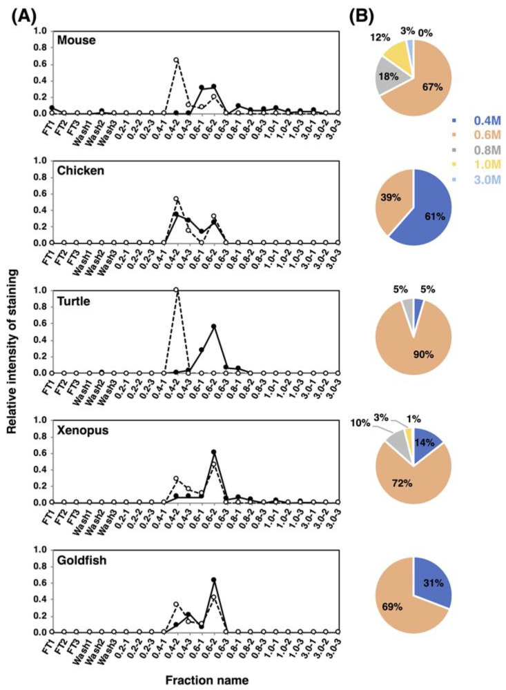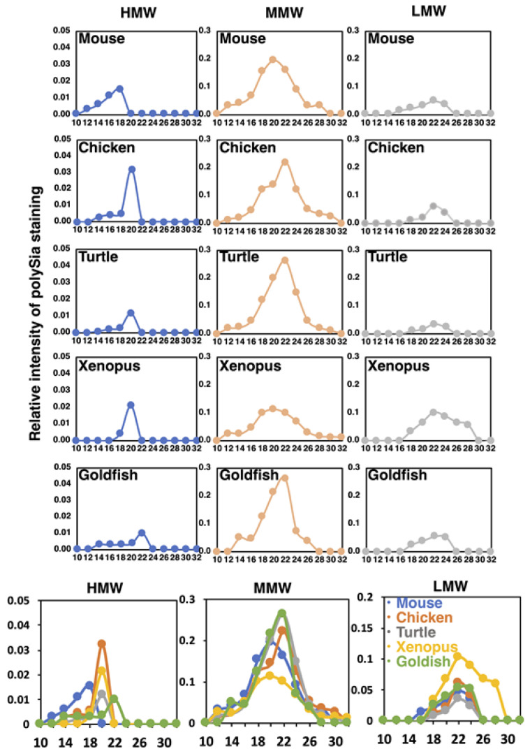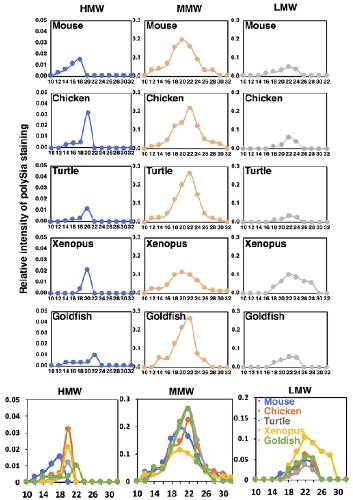Figure 9. Sephacryl S-500 chromatograms of polySia-NCAM of brain homogenates from five vertebrate brains. Brains from five different vertebrates (mouse, chicken, turtle, xenopus, and goldfish, n = 1) were analyzed by the gel filtration. The elution profiles were monitored by native-PAGE/Western blotting of each fraction using 12E3 (Figure S3A). The left, middle, and right panels for each animal brain show the elution profiles in the regions of HMW (above 720 kDa), MMW (480–720 kDa), and LMW (less than 480 kDa), respectively. The sum of the intensity of the immunostaining of the fractions was set to 1.0. At the bottom panels, merged images of the profiles for five different vertebrate brains are shown. |