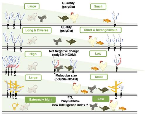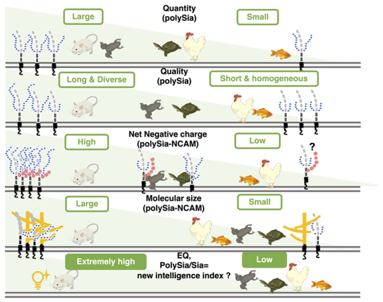 Figure 11. The quantity and quality of polySia and the features of polySia-NCAM in five different vertebrate brains. PolySia-NCAM is highly regulated in both quantity and quality (DP, net negative charge, and size) among the five different vertebrate brains. |