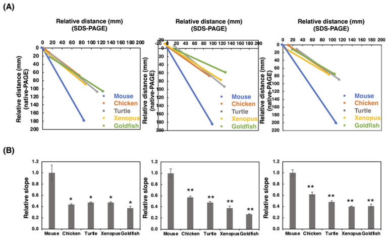 Figure 4. SDS-PAGE/native-PAGE MAP. The S/N MAP of brains from five different vertebrates is described based on the results of blots with each antibody. The results of SDS-PAGE (Figure 2) and native-PAGE (Figure 3) were used. (A) The typical S/N map of 12E3, 735, and 12F8 staining. (B) Relative slope value, K. The value for mouse was set to 1.0. The left, middle, and right panels stand for 12E3, 735, and 12F8, respectively. The values were obtained from the S/N maps from five different vertebrate brains (n = 3). * indicates p < 0.05. ** indicates p < 0.01. |