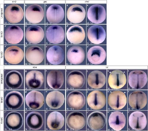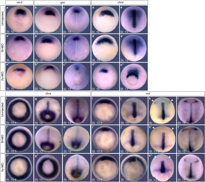 Figure 2. Dorsal fry-depletion affects early expression of organizer genes and causes gastrulation defects. (aâlââ) In situ hybridization of Xenopus embryos at the indicated stages. (aâaââ) Expression of otx2 in the presumptive prechordal mesoderm. (a) Uninjected embryo (Nâ=â2; nâ=â33). (aâ) St-MO injected embryo (Nâ=â2; nâ=â33; 6% with reduced expression domain) (aââ) fry-MO injected embryo (Nâ=â2; nâ=â26; 85% with reduced expression domain). (b,cââ) Expression of gsc in the presumptive prechordal mesoderm. (b) Uninjected St.10 embryo (Nâ=â3; nâ=â98). (bâ) fry-MO injected St.10 embryo (Nâ=â2; nâ=â34; 6% with reduced expression domain) (bââ) fry-MO injected St.10 embryo (Nâ=â3; nâ=â74; 78% with reduced expression domain). Dorsal is oriented to the top. (c) Uninjected St.13 embryo (Nâ=â3; nâ=â60). (câ) St-MO injected St.13 embryo (Nâ=â2; nâ=â30; 10% with abnormally positioned expression domain). (cââ) fry-MO injected St.13 embryo (Nâ=â3; nâ=â62; 87% and 96% with reduced and abnormally positioned expression domain, respectively).The distance between the blastopore and the prechordal mesoderm expressing gsc (dashed line) is reduced in the morphants. Dorsal views, anterior is oriented to the top. (d,eââ) Expression of chrd in the presumptive axial mesoderm. (d) Uninjected St. 10 embryo (Nâ=â5; nâ=â95). (dâ) St-MO injected St. 10 embryo (Nâ=â2; nâ=â34; 6% with reduced expression domain) (dââ) fry-MO injected St. 10 embryo (Nâ=â5; nâ=â113; 97% with reduced expression domain). Dorsal is oriented to the top. (e) Uninjected St.13 embryo (Nâ=â4; nâ=â128). (eâ) St-MO injected St.13 embryo (Nâ=â2; nâ=â30, 10% with abnormally positioned expression domain) (eââ) fry-MO injected St.13 embryo (Nâ=â4; nâ=â115, 92% and 95% with reduced and abnormally positioned expression domain, respectively). Dorsal views, anterior is oriented to the top. (fâhââ) Expression of pan-mesodermal marker brachyury (xbra). (f) Uninjected St. 10.5 embryo (Nâ=â3; nâ=â47). (fâ) St-MO injected St. 10.5 embryo (Nâ=â2; nâ=â31). (fââ) fry-MO injected St. 10.5 embryo (Nâ=â3; nâ=â53). (g) Uninjected St. 13 embryo (Nâ=â2; nâ=â44). (gâ) St-MO injected St. 13 embryo (Nâ=â2; nâ=â28; 7% with abnormally positioned expression domain) (gââ) fry-MO injected St. 13 embryo (Nâ=â2; nâ=â52; 98% with abnormally positioned expression domain). (h) Uninjected St. 15 embryo (Nâ=â3; nâ=â48). (hâ) St-MO injected St. 15 embryo (Nâ=â2; nâ=â33). (hââ) fry-MO injected St. 15 embryo (Nâ=â3; nâ=â45). Dorsal views, anterior is oriented to the top. (iâlââ) Expression of not in the chordamesoderm and anterior neuroectoderm. (i) Uninjected St. 10.5 embryo (Nâ=â2; nâ=â52). (iâ) St-MO injected St. 10.5 embryo (Nâ=â2; nâ=â31). (iââ) fry-MO injected St. 10.5 embryo (Nâ=â2; nâ=â47). (j) Uninjected St. 13 embryo (Nâ=â3; nâ=â39). Dorsal is oriented to the top. (jâ) St-MO injected St. 13 embryo (Nâ=â2; nâ=â27; 4% abnormally positioned expression domain). (jââ) fry-MO injected St. 13 embryo (Nâ=â3; nâ=â43; 100% with abnormally positioned expression domain). (k) Uninjected St. 13.5 embryo (Nâ=â2; nâ=â29). (kâ) St-MO injected St. 13.5 embryo (Nâ=â2; nâ=â24). (kââ) fry-MO injected St. 13.5 embryo (Nâ=â2; nâ=â32, 63% with abnormally positioned expression domain). (l) Uninjected St. 15 embryo (Nâ=â3; nâ=â46). (lâ) St-MO injected St. 15 embryo (Nâ=â2; nâ=â28). (lââ) fry-MO injected St. 15 embryo (Nâ=â3; nâ=â59). Dorsal views, anterior is oriented to the top. Note: not expression in the epiphysis (arrowheads) is initiated in fry-depleted embryos at the same time as controls, indicating the morphants are not developmentally delayed. Dashed lines indicate dorsal mesoderm elongation. The stage of injected embryos was established based on the stage of uninjected embryos from the same clutch. Representative embryos are shown. Embryos were injected into both dorsal blastomeres at the 4-cell stage with 15Â ng of fry-MO or St-MO. |