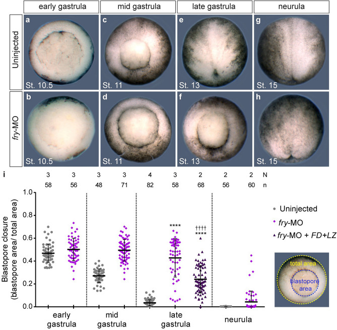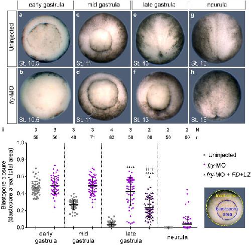 Figure 3. Fry is required for normal blastopore closure. (aâh) Uninjected or fry-MO (15Â ng) injected embryos were fixed at the indicated gastrulation stage for blastopore closure measurements. Representative embryos for each stage are shown. Gastrula stage embryos are oriented dorsal to the top and neurula stage embryos are oriented anterior to the top. (i) Left: Quantification of the blastopore closure measurements on fixed uninjected embryos, fry-MO (15Â ng) injected embryos and fry-MO (15Â ng)â+âFDâ+âLZ mRNA (800Â pg) co-injected embryos at the indicated gastrulation stage. Right: Image showing the blastopore area (blue) and the area of the vegetal hemisphere of the embryo (total area, yellow). The ratio of these two measurements is plotted. 0â=âblastopore closed. N: number of independent experiments, n: number of embryos. The stage of injected embryos was established based on the stage of uninjected control embryos. Means and standard deviation are indicated. Each point represents a single fixed embryo. Statistical significance was evaluated using KruskalâWallis test and Dunn's multiple comparisons test (****,â â â â pâ<â0.0001). * represents the comparison to the uninjected group and â represents the comparison to the fry-MO injected group. |