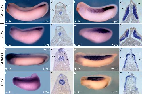Supplementary Fig. S2. Differentiated axial structures are present in dorsally fry-depleted embryos. (a,b) Expression of chrd in stage 28 (St. 28) embryos by in situ hybridization. (a) Uninjected embryo (N = 2; n = 36). (b) fry-MO (15 ng) injected embryo (N = 2; n = 41). (c,d) Expression of myoD in the paraxial mesoderm of stage 28 (St. 28) embryos by in situ hybridization. (c) Uninjected embryo (N = 2; n = 40). (d) fry-MO (15 ng) injected embryo (N = 2; n = 43). (e,f) Notochord immunostaining with MZ15 antibody of stage 32 (St. 32) embryos. (e) Uninjected embryo (N = 2; n = 28). (f) fry-MO (15 ng) injected embryo (N = 2; n = 34). (g,h) Somitic muscle immunostaining with 12/101 antibody of stage 32 (St. 32) embryos. (g) Uninjected embryo (N = 2; n = 31). (h) fry-MO (15 ng) injected embryo (N = 2; n = 30). N: number of independent experiments, n: number of embryos. Embryos with representative expression or staining patterns are shown. All embryos analyzed showed positive staining. (aâ-hâ) Histological preparations (transverse sections) of embryos showed on a-h. nc: notochord; nt: neural tube; sm: somites. Note that both axial tissues are detected in fry morphant embryos, however they develop abnormally (e.g. reduced notochord diameter, discontinuous muscle staining). |