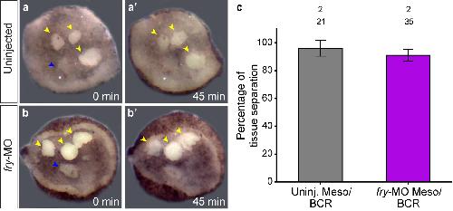 Supplementary Fig. S5. Fry depletion does not affect tissue separation behavior of dorsal mesoderm cells. (a,b) BCR assay for separation behavior in Xenopus embryos. Dorsal mesoderm test aggregates (yellow arrowheads) or deep layer of the ectoderm test aggregates (blue arrowheads) were prepared from uninjected (a) or fry-MO (15 ng) injected embryos (b) and placed on an uninjected explanted BCR. Representative aggregates are shown. Tissue separation behavior was evaluated at time (t) = 45 min (aâ,bâ). Test aggregates that remained on explanted BCR surface are indicated by arrowheads. Note that ectodermal aggregates sunk on the surface of the explanted BCR while dorsal mesoderm test aggregates remain on the surface. (c) Quantification of BCR assay: percentage of mesoderm aggregates that exhibited tissue separation behavior. Data in the graph is presented as means with standard deviation. N: number of independent experiments, n: number of mesoderm test aggregates. Statistical significance was evaluated using two-tailed Mann Whitney U-test. No statistically significant differences were found between groups (p = 0.4258). |