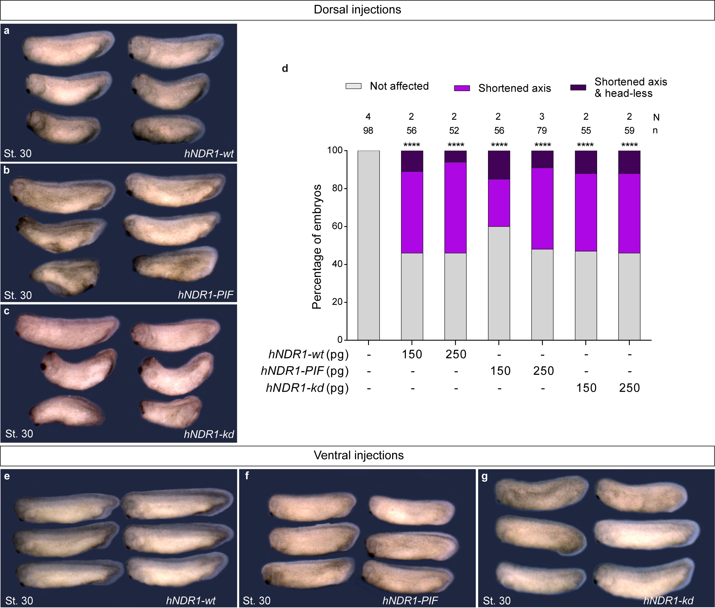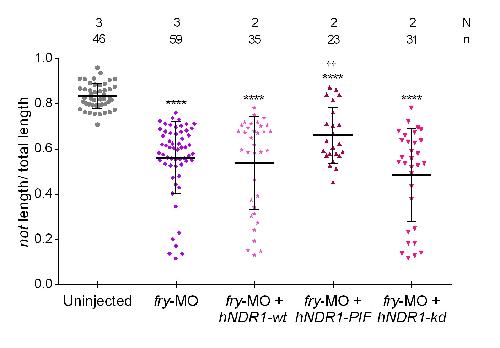 Supplementary Fig. S6. hNDR1-PIF rescues the chordamesoderm elongation in fry-depleted embryos. Neurula stage embryos (St. 15) were subject to in situ hybridization for notochord homeobox, not. Dorsal midline tissues elongation was measure as the length of not expression domain divided by the length of the whole-embryo of uninjected embryos, fry-MO (15 ng) injected embryos, fry-MO (15 ng) + hNDR1-wt mRNA (250 pg) coinjected embryos, fry-MO (15 ng) + hNDR1-PIF mRNA (250 pg) coinjected embryos, fry-MO (15 ng) + hNDR1-kd mRNA (250 pg) coinjected embryos. N: number of independent experiments, n: number of embryos. The stage of injected embryos was established based on the stage of uninjected littermates and confirmed by the presence of not expression in the anterior neuroectodermal domain. Data in the graphs is presented as means with standard deviation. Each point represents a single embryo. Statistical significance was evaluated using Kruskal-Wallis test and Dunn's multiple comparisons test (**** p<0.0001, â â p< 0.01). * represents the comparison to the uninjected group and â represents the comparison to the fry-MO injected group. |
