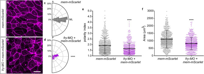 Figure 6. Loss of Fry affects morphological polarity and orientation of dorsal mesoderm cells. (a,b) Dorsal marginal zone explants were prepared from Xenopus embryos at early gastrula stage (St. 10.5) and the vegetal alignment zone (VgAZ)5, which corresponds to the axial mesoderm, was imaged at late gastrula stage (St. 13) to assess dorsal mesoderm cell morphology. (a) mem-mScarlet mRNA injected embryo (Nâ=â2, nâ=â7). (b) fry-MO (15 ng)â+âmem-mScarlet mRNA co-injected embryo (Nâ=â2, nâ=â7). N: number of independent experiments, n: number of explants. Scale bar: 100 μm. Representative explants are shown. (c,d) Cell orientation was quantified as the angle of the cellâs major axis with respect to the mediolateral axis (ML). The circles in the rose diagram refer to the percentage of cells that exhibited polarity angles for each bin. Orientation angles were binned from 0° to 90° in bins of 11.25°. A: anterior, P: posterior, ML: mediolateral. (c) mem-mScarlet mRNA injected embryo (total number of cells analyzedâ=â147). (d) fry-MOâ+âmem-mScarlet mRNA co-injected embryo (total number of cells analyzedâ=â151). Statistically significant differences were found between groups, Chi-square test (****pâ<â0.0001). (e) Polarity index measurements of dorsal mesoderm cells calculated as the ratio between cell major axis and minor axis. (f) Cellular area measurements of dorsal mesoderm cells. (e,f) mem-mScarlet mRNA injected embryos (total number of cells analyzedâ=â660); fry-MOâ+âmem-mScarlet mRNA co-injected embryos (total number of cells analyzedâ=â632). Each point represents a single cell. Statistical significance was evaluated using two-tailed Mann Whitney U-test. **** pâ<â0.0001 indicates statistically significant differences between groups. Means and standard deviation are indicated. |