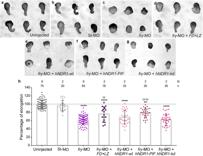 Figure 8. Loss of Fry impairs convergent extension movements and can be compensated by constitutively active hNDR1-PIF kinase. (aâg) Dorsal marginal zone explants were prepared from Xenopus embryos at early gastrula stage (St. 10.5) and culture until late neurula stage (St. 19) when the elongation of the explant was evaluated. (a) Uninjected embryos. (b) Standard Control morpholino (St-MO) (15Â ng) injected embryos. (c) fry-MO (15Â ng) injected embryos and (d) fry-MO (15Â ng)â+âFDâ+âLZ mRNA (800Â pg) co-injected embryos. (e) fry-MO (15Â ng)â+âhNDR1-wt mRNA (250Â pg) co-injected embryos (f) fry-MO (15Â ng)â+âhNDR1-PIF mRNA (250Â pg) co-injected embryos and (g) fry-MO (15Â ng)â+âhNDR1-kd mRNA (250Â pg) co-injected embryos. Representative explants are shown. (h) Percentage of elongation of dorsal marginal zone explants from embryos treated as indicated. Elongation was calculated as the difference between the initial and final length of the explants (St. 10.5 vs. St. 19) relative to the mean of the uninjected group (considered 100% elongation, dotted line). Each point represents a single explant. N: number of independent experiments, n: number of explants. Statistical significance was evaluated using KruskalâWallis test and Dunn's multiple comparisons test (****,â â â â pâ<â0.0001 and **,â â pâ<â0.01). * represents the comparison to the uninjected group and â represents the comparison to the fry-MO injected group. |