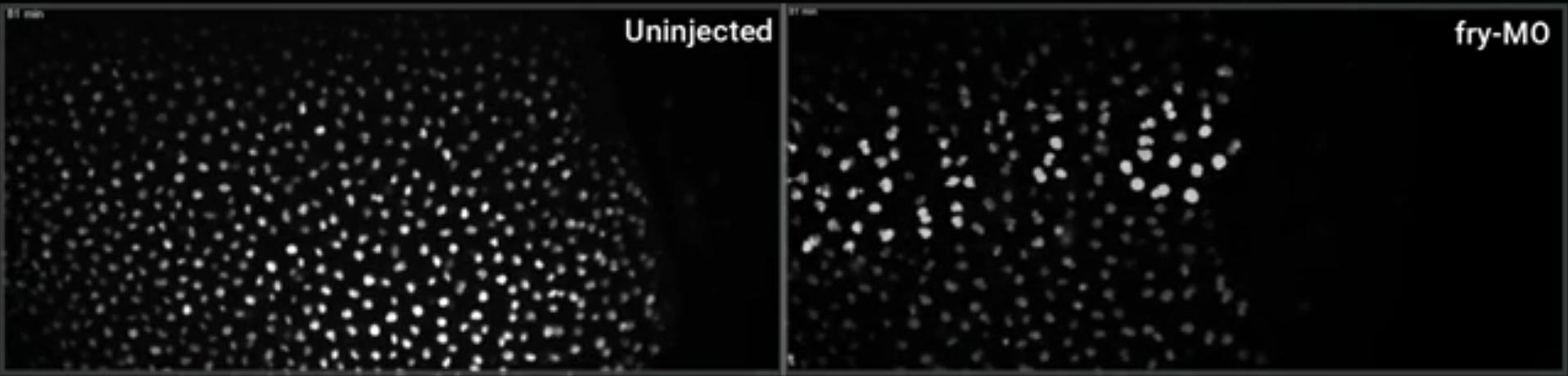 Still from Supplementary Movie S2. Time-lapse movies of representative embryos subjected to light-sheet fluorescence microscopy. (left) H2B-eGFP mRNA injected embryo (control). (right) fry-MO (15 ng) and H2B-eGFP mRNA coinjected embryo. 1 frame every 3 minutes. |