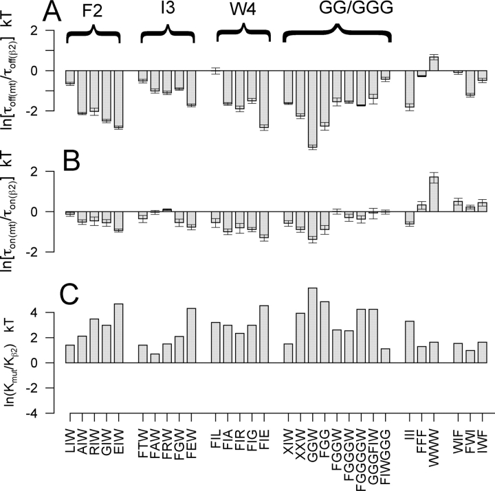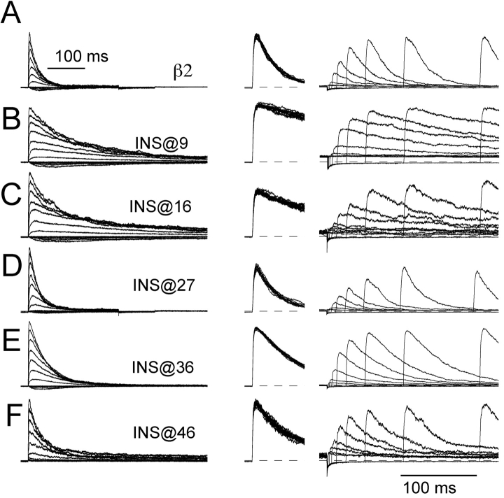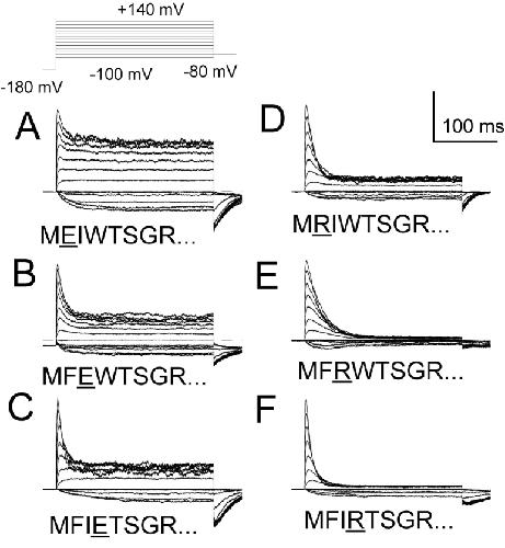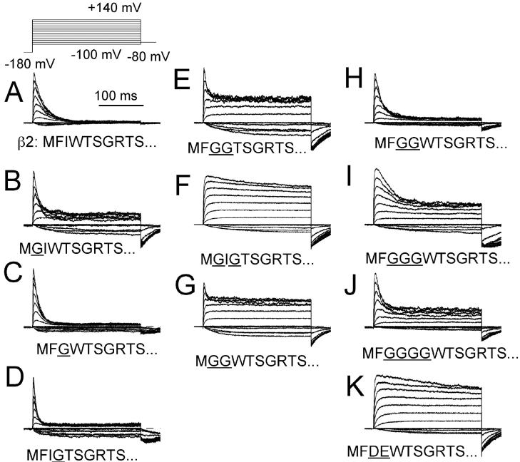 An auxiliary beta2 subunit, when coexpressed with Slo alpha subunits, produces inactivation of the resulting large-conductance, Ca(2+) and voltage-dependent K(+) (BK-type) channels. Inactivation is mediated by the cytosolic NH(2) terminus of the beta2 subunit. To understand the structural requirements for inactivation, we have done a mutational analysis of the role of the NH(2) terminus in the inactivation process. The beta2 NH(2) terminus contains 46 residues thought to be cytosolic to the first transmembrane segment (TM1). Here, we address two issues. First, we define the key segment of residues that mediates inactivation. Second, we examine the role of the linker between the inactivation segment and TM1. The results show that the critical determinant for inactivation is an initial segment of three amino acids (residues 2-4: FIW) after the initiation methionine. Deletions that scan positions from residue 5 through residue 36 alter inactivation, but do not abolish it. In contrast, deletion of FIW or combinations of point mutations within the FIW triplet abolish inactivation. Mutational analysis of the three initial residues argues that inactivation does not result from a well-defined structure formed by this epitope. Inactivation may be better explained by linear entry of the NH(2)-terminal peptide segment into the permeation pathway with residue hydrophobicity and size influencing the onset and recovery from inactivation. Examination of the ability of artificial, polymeric linkers to support inactivation suggests that a variety of amino acid sequences can serve as adequate linkers as long as they contain a minimum of 12 residues between the first transmembrane segment and the FIW triplet. Thus, neither a specific distribution of charge on the linker nor a specific structure in the linker is required to support the inactivation process.