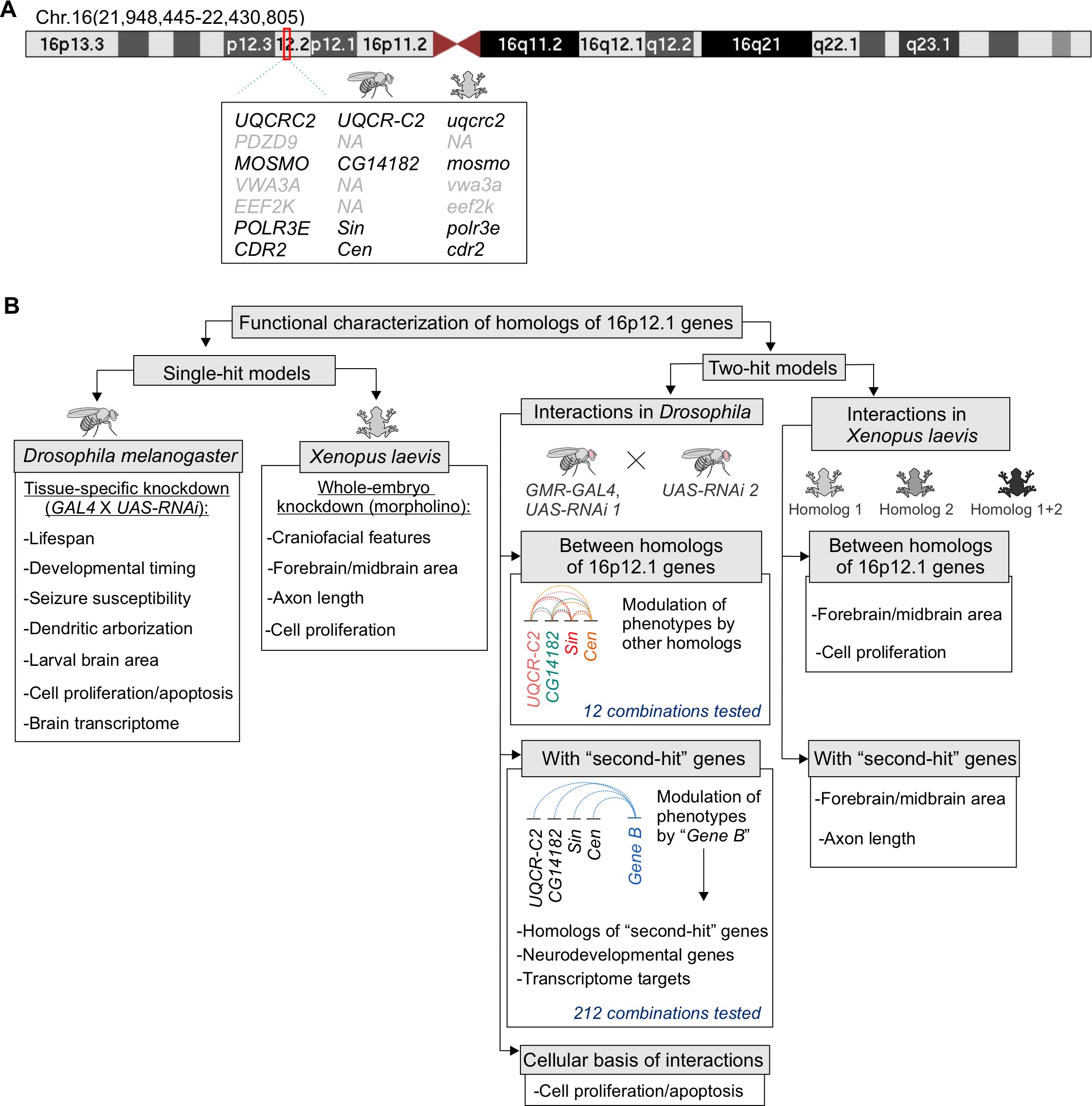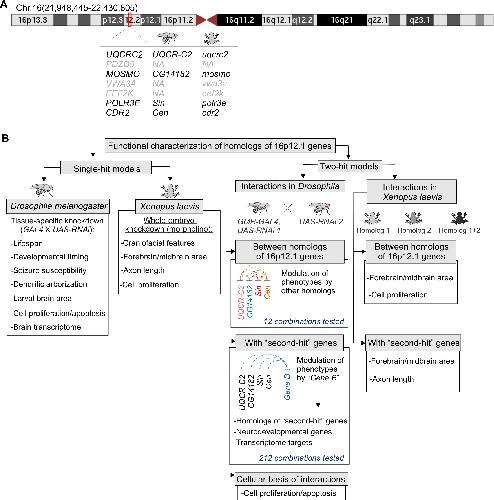 Fig 1. Strategy to evaluate the individual contributions of homologs of 16p12.1 genes and their interactions with âsecond-hitâ genes towards neurodevelopmental phenotypes. (A) Ideogram of human chromosome 16 indicating the deleted region on UCSC genome build GRCh37, hg19 (chr16:21,948,445â22,430,805) (also known as 16p12.2 deletion). Seven protein coding genes are located within the 16p12.1 deletion region, including UQCRC2, PDZD9, MOSMO, VWA3A, EEF2K, POLR3E, and CDR2. Four out of the seven genes are conserved in both Drosophila melanogaster and Xenopus laevis. (B) We performed global and functional domain-specific phenotypic assessment using RNAi lines and tissue-specific knockdown in Drosophila, and morpholino-mediated whole embryo knockdown in X. laevis, to identify individual contributions of 16p12.1 homologs towards different developmental and neuronal features. We next evaluated the effect of pairwise knockdown of 16p12.1 homologs towards eye phenotypes in Drosophila, and brain size and cellular proliferation defects in X. laevis. We characterized 212 interactions between the 16p12.1 homologs and homologs of patient-specific âsecond-hitâ genes identified in children with the deletion, genes within conserved neurodevelopmental pathways, and differentially-expressed genes identified from RNA-seq analysis. We found that homologs of âsecond-hitâ genes participate in complex genetic interactions with 16p12.1 homologs to modulate neurodevelopmental and cellular phenotypes. https://doi.org/10.1371/journal.pgen.1009112.g001 |