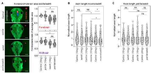 S20 Fig. setd5 modifies phenotypes observed with knockdown of polr3e and mosmo in X. laevis. (A) Representative images stained with anti-tubulin show forebrain (red on control image) and midbrain (blue) areas of the side injected with morpholino (right, red asterisk), normalized to the uninjected side (left). Simultaneous knockdown of polr3e and setd5 in X. laevis led to decreased forebrain (n = 28, two-tailed studentâs t-test, *p = 6.01Ã10â7) and midbrain area (*p = 1.67Ã10â7) compared to knockdown of polr3e alone, which were not different to the partial knockdown of setd5 alone (p>0.05). Scale bar represents 500 μm. (B) Normalized axon length of X. laevis tadpoles with simultaneous knockdown of mosmo and setd5 showed decreased axon length different from the control injected with 22ng of morpholino (n = 438, two-tailed, studentâs t-test, *p = 2.95Ã10â7) and from individual knockdown of setd5 (*p = 1.86Ã10â9) or mosmo (*p = 3.34Ã10â6), showing a synergistic effect of decreased dosage of the homologs towards neuronal phenotypes. (C) Normalized axon length of X. laevis tadpoles with simultaneous knockdown of polr3e and setd5 showed no change in axon length (two-tailed studentâs t-test, p>0.05). In each case, the individual knockdown was normalized and compared to the control injected with the same amount of morpholino. Boxplots represent all data points with median, 25th and 75th percentiles. Statistical details, including sample size, confidence intervals, and p-values, are provided in S6 File. https://doi.org/10.1371/journal.pgen.1009112.s020 |