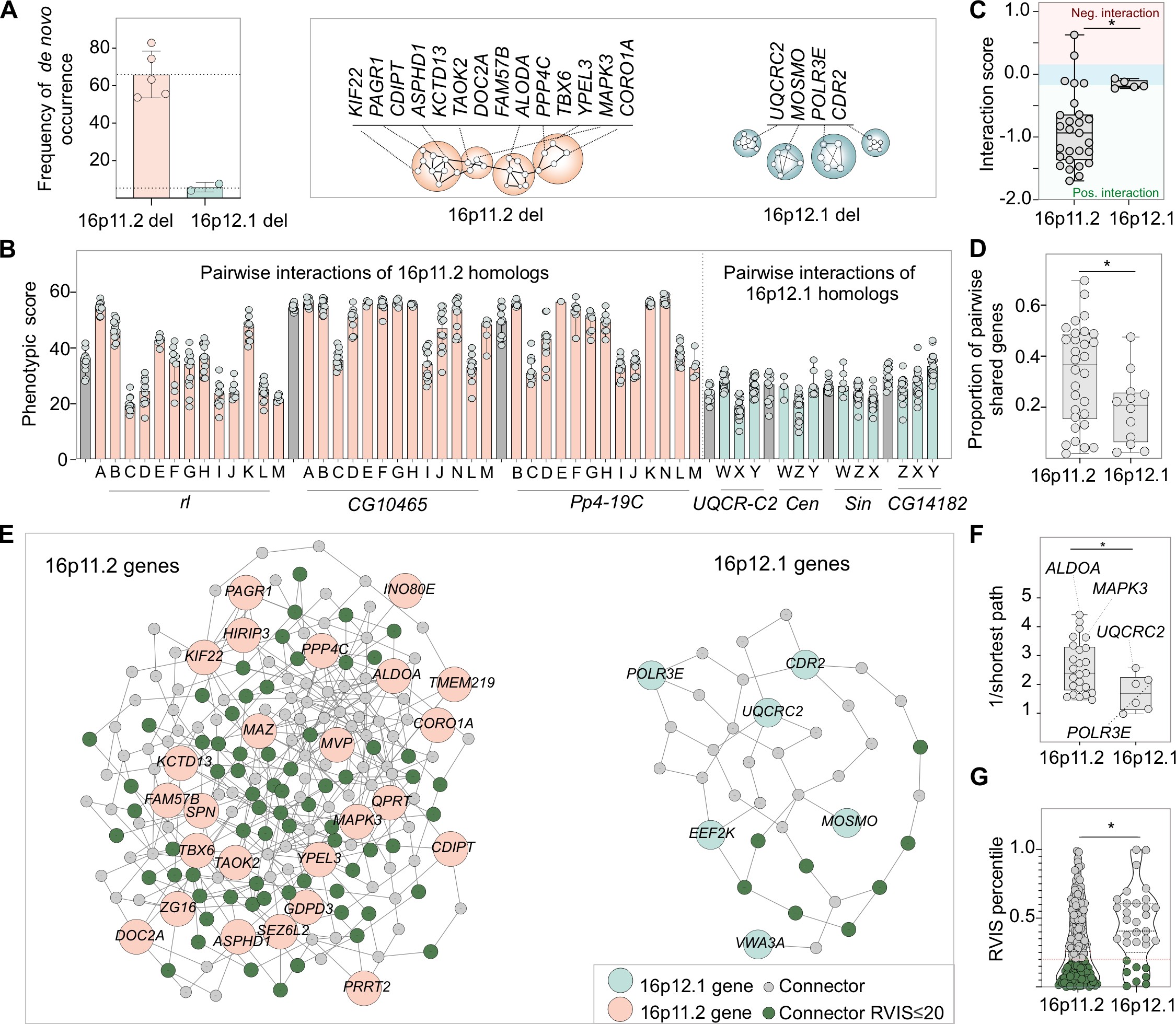 Fig 7. Functional relatedness of genes within disease-associated CNV regions correspond with higher pathogenicity. (A) Bar plot shows frequency of reported de novo occurrence of the 16p12.1 deletion [9,11] compared to the autism-associated 16p11.2 deletion [11,74,75]. Schematic shows a model for higher functional connectivity of genes within the 16p11.2 region compared to the 16p12.1 region. Only genes with Drosophila homologs are represented. (B) Phenotypic scores of individual 16p11.2 homologs (grey) are significantly enhanced or suppressed by a second 16p11.2 homolog (orange). In contrast, little variation in phenotypic scores is observed for 16p12.1 homologs (grey) with simultaneous knockdown of another homolog (green). The interacting homologs are labeled as follows: A: Pp4-19C (PPP4C), B: CG17841 (FAM57B), C: coro (CORO1A), D: Ald1 (ALDOA), E: Rph (DOC2A), F: Tao (TAOK2), G: Asph (ASPHD1), H: klp68D (KIF22), I: Pa1 (PAGR1), J: Pis (CDIPT), K: CG10465 (KCTD13), L: CG15309 (YPEL3), M: Doc3, (TBX6), N: rl (MAPK3), W: CG14182 (MOSMO), X: Cen (CDR2), Y: Sin (POLR3E), Z: UQCR-C2 (UQCRC2). (C) Pairwise knockdown of homologs of 16p11.2 genes (n = 27) show a larger magnitude of interactions compared with those among 16p12.1 homologs (n = 5, two-tailed Mann-Whitney test, *p = 0.011). Interaction values of zero (blue shade) represent no interactions, while values above or below zero represent negative (in red) and positive (in green) interactions, respectively. (D) Pairs of 16p11.2 homologs exhibit a higher proportion of shared differentially-expressed genes compared to pairs of 16p12.1 homologs (n = 30 for 16p11.2, n = 12 for 16p12.1, two-tailed Mann-Whitney test, *p = 0.031). (E) Network diagram shows connections between human 16p11.2 or 16p12.1 genes within a brain-specific interaction network. 16p12.1 genes are indicated in green, 16p11.2 genes in orange, connector genes in grey, and connector genes that are intolerant to functional variation (RVIS ⤠20th percentile) in dark green. C16orf92 and C16orf54 for 16p11.2 and PDZD9 for 16p12.1 were not present in the brain network and were therefore excluded from the network analysis. (F) Genes within the 16p11.2 region show higher average pairwise connectivity in a human brain-specific network, measured as the inverse of the shortest paths between two genes, compared to 16p12.1 genes (n = 25 for 16p11.2, n = 6 for 16p12.1, two-tailed Mann-Whitney, *p = 0.036, see S5 File). (G) 16p11.2 connector genes have lower RVIS percentile scores compared to 16p12.1 connector genes (n = 166 for 16p11.2, n = 33 for 16p12.1, two-tailed Mann-Whitney, *p = 0.017, see S5 File). Functionally-intolerant genes are represented in dark green. Boxplots represent all data points with median, 25th and 75th percentiles. Statistical details are provided in S6 File. https://doi.org/10.1371/journal.pgen.1009112.g007 |