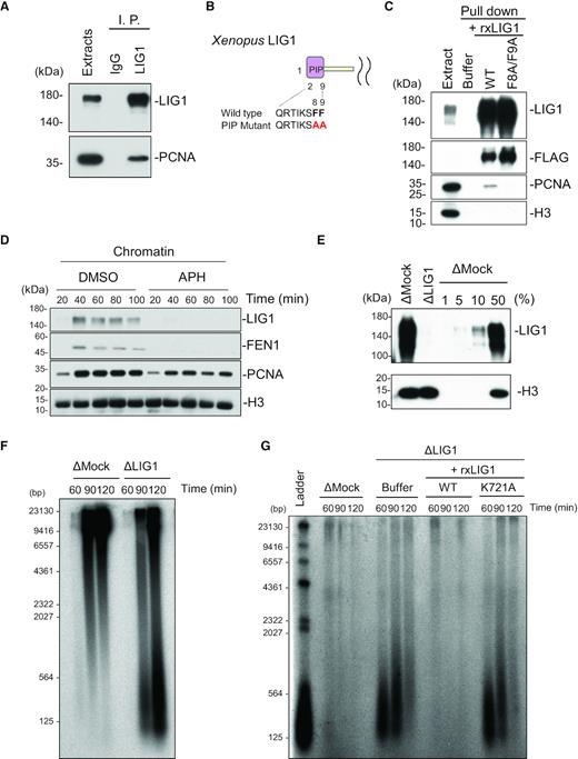 Figure 1. Depletion of LIG1 inhibits Okazaki fragment ligation in Xenopus egg extracts. (A) Control or xLIG1 antibodies were used for immunoprecipitation (I. P.) and immunoprecipitated proteins were analyzed by immunoblotting using the indicated antibodies (n = 2). (B) Sequences of the wild-type and the F8A/F9A mutant PIP-box in xLIG1 are shown. (C) Recombinant wild-type xLIG1â3 à Flag or xLIG1-F8A/F9A-3 à Flag was added to the egg extracts. Immunoprecipitation using anti-Flag antibodies was performed and resultant immunoprecipitates were analyzed by immunoblotting using the indicated antibodies (n = 2). (D) Interphase egg extracts were added with sperm chromatin and incubated in the presence of 30 μM aphidicolin or in its absence (DMSO). Chromatin fractions were isolated and analyzed by immunoblotting using the indicated antibodies (n = 2). (E) Immunodepletion efficiency of xLIG1 from Xenopus egg extract (n = 3). (F) Replication products in mock- or xLIG1-depleted extracts were separated by alkaline agarose gel electrophoresis followed by autoradiography (n = 2). (G) xLIG1-depleted extracts were supplemented with wild-type xLIG1â3 à Flag or xLIG1-K721A-3 à Flag and chromatin was isolated. Purified genomic DNA from chromatin was labeled using exonuclease-deficient Klenow fragment and α-32P dCTP, and separated in a denaturing agarose gel (n = 2). |