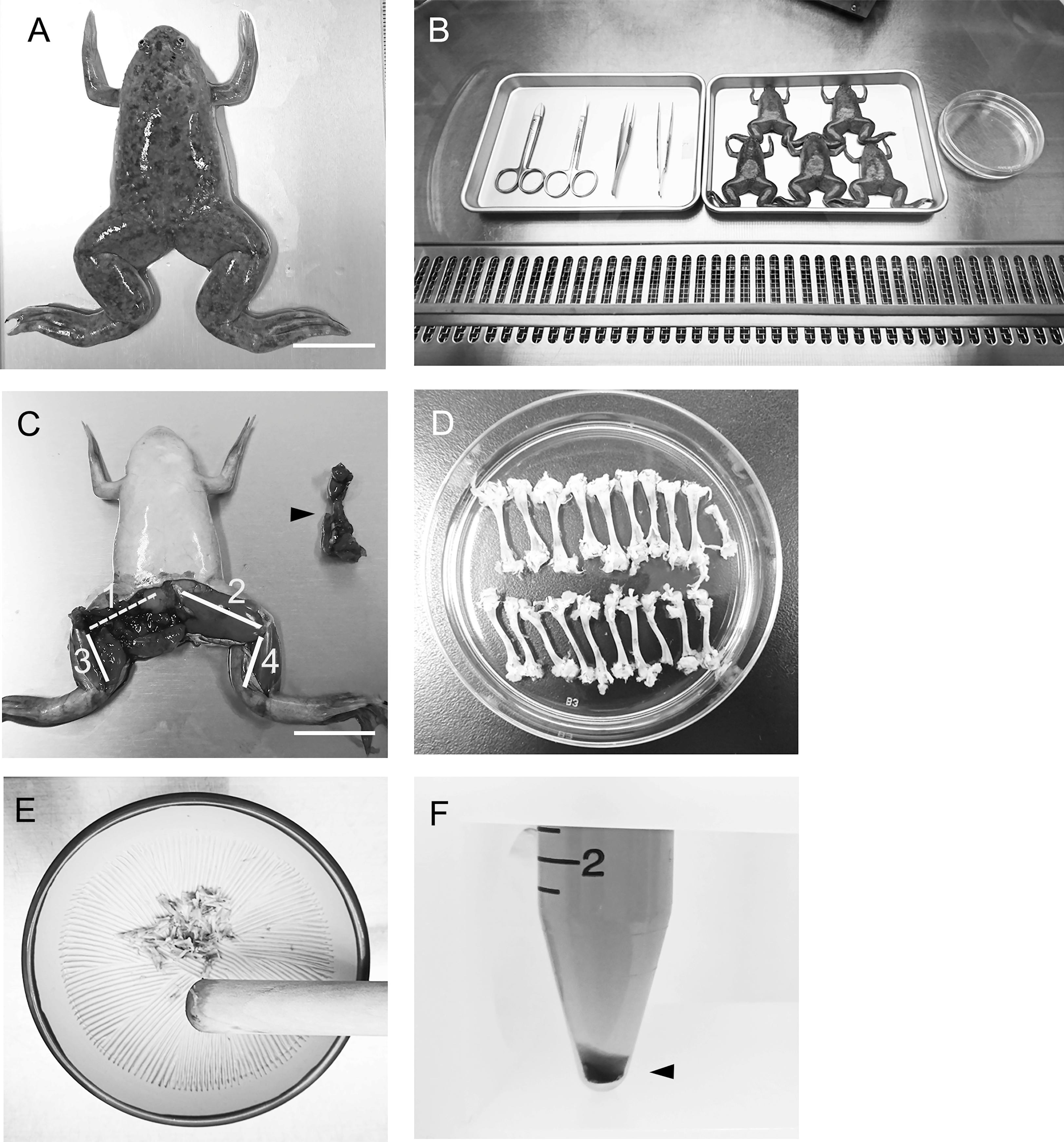Fig. 1. Isolation of bone marrow stromal cells from Xenopus laevis. (A) Froglets with a snout-vent length of ~ 5 cm were used. Scale bar = 2 cm. (B) Five froglets were used for each 10-cm plastic dish. (C) Two femurs and two tibiofibulas were collected from each froglet. #1 and #2 indicate femurs, and #3 and #4 indicate tibiofibulas. Black arrowhead indicates the removed femur #1. Scale bar = 2 cm. (D) Ten femurs and Ten tibiofibulas were collected from 5 froglets. (E) The collected bones were crushed in the mortar. (F) Crushed bones were treated with collagenase and dispase. The mixture was filtered through the cell strainer, then centrifuged. Finally, the bone marrow stromal cell pellet was collected (black arrowhead).