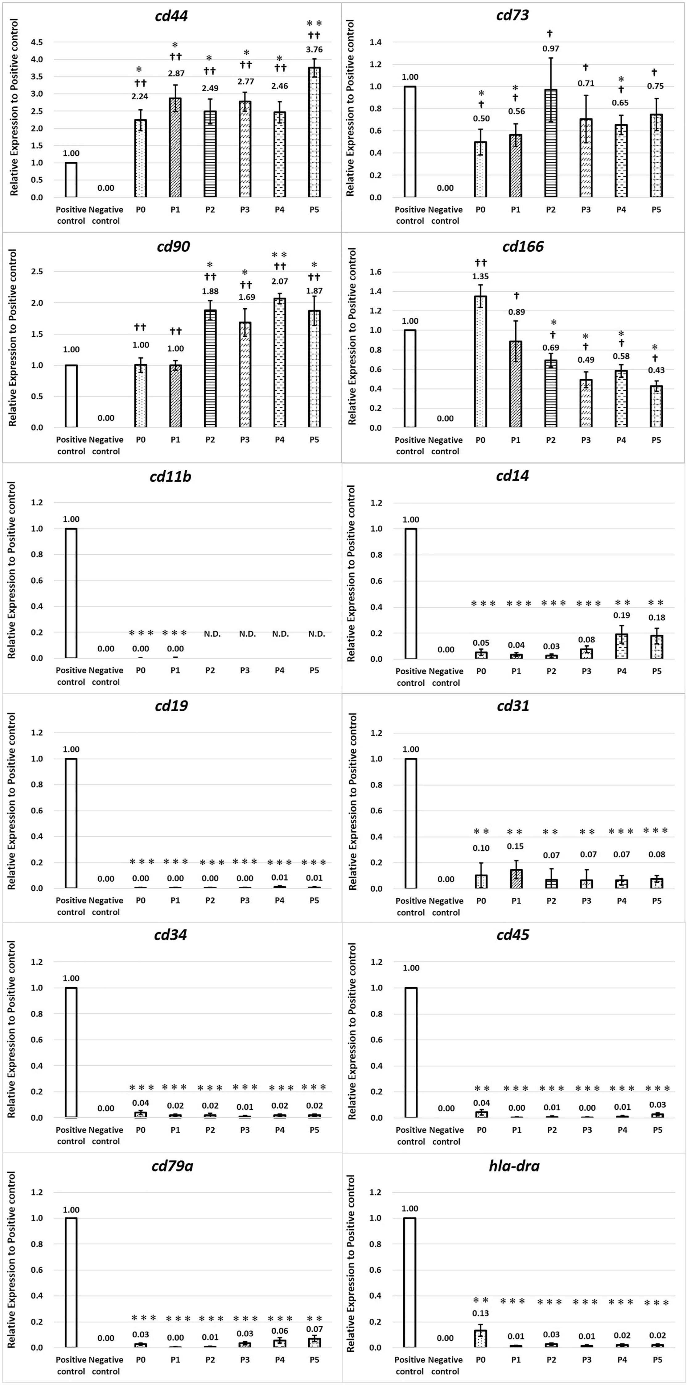 Fig. 3. Expression of cd markers. odc was used as an internal control for Xenopus laevis. Data show the mean of triplicate independent samples and error bars represent the SD. Statistical significance was calculated by a 2-tailed Student t-test, and defined as *, p < 0.05; **, p < 0.01; ***, p < 0.001 compared with each positive control, or â , p < 0.05; â â , p < 0.01; â â â , p < 0.001 compared with each negative control. N.D. means not detected.