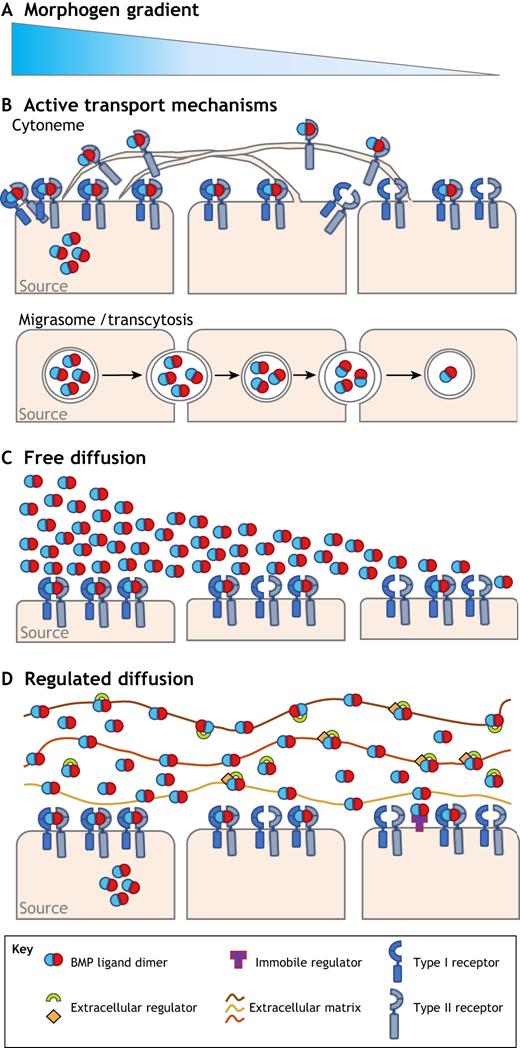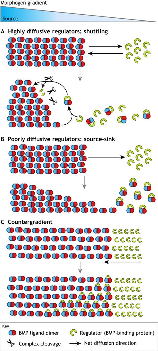 Pattern formation by bone morphogenetic proteins (BMPs) demonstrates remarkable plasticity and utility in several contexts, such as early embryonic development, tissue patterning and the maintenance of stem cell niches. BMPs pattern tissues over many temporal and spatial scales: BMP gradients as short as 1-2 cell diameters maintain the stem cell niche of the Drosophila germarium over a 24-h cycle, and BMP gradients of several hundred microns establish dorsal-ventral tissue specification in Drosophila, zebrafish and Xenopus embryos in timescales between 30 min and several hours. The mechanisms that shape BMP signaling gradients are also incredibly diverse. Although ligand diffusion plays a dominant role in forming the gradient, a cast of diffusible and non-diffusible regulators modulate gradient formation and confer robustness, including scale invariance and adaptability to perturbations in gene expression and growth. In this Review, we document the diverse ways that BMP gradients are formed and refined, and we identify the core principles that they share to achieve reliable performance.