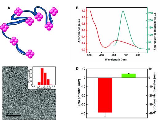 Figure 1. Synthesis and characterization of silver nanoclusters (AgNCs). (A) Schematic diagram of AgNCs. (B) Absorbance and fluorescence spectra of AgNCs. (C) Transmission electron microscopy (TEM) image and corresponding size distribution histogram of AgNCs. Scale bars, 20 nm. (D) Zeta potential and hydrodynamic diameter of AgNCs. |