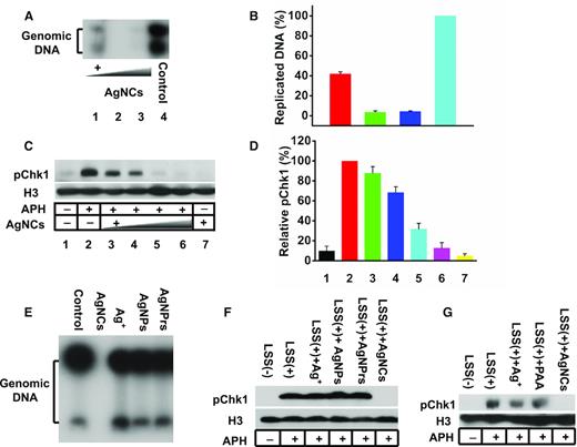 Figure 2. AgNCs uniquely inhibit DNA replication and replication checkpoint. (A, B) DNA replication in extracts is sensitive to AgNCs. (A) Xenopus egg extracts were incubated with sperm nuclei in the presence of increasing concentrations of AgNCs. DNA replication was monitored by agarose gel electrophoresis after incorporation of α-[32P]dCTP into genomic DNA. (B) Quantification of three independent experiments normalized to untreated controls. (C, D) AgNCs inhibit the DNA replication checkpoint. (C) Xenopus egg extracts were treated with aphidicolin with or without AgNCs at different concentrations and incubated with sperm nuclei. ATR activation was monitored by pChk1 western blotting. (D) Quantification of three independent experiments normalized to aphidicolin alone control. Impact of different silver nanomaterials on DNA replication and replication checkpoint. (E) Replicating extracts were incubated with silver ions (Ag+), silver nanoparticles (AgNPs), silver nanoprisms (AgNPrs) and silver nanoclusters (AgNCs) and DNA replication was assessed by incorporation of α-[32P]dCTP into genomic DNA. (F, G) The impact of Ag+, AgNPs, AgNPrs AgNCs and PAA on DNA replication checkpoint was monitored by pChk1 Western blotting. |