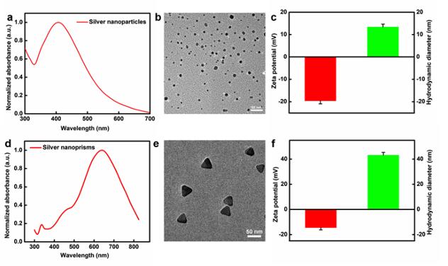 Figure S1. Synthesis and characterization of silver nanoparticles (AgNPs) and silver nanoprisms (AgNPrs). (a, d) Absorbance and fluorescence spectra of AgNPs and AgNPrs. (b, d) Transmission Electron Microscopy (TEM) images of AgNPs and AgNPrs. Scale bars, 50 nm. (c, f) Zeta potential and hydrodynamic diameter of AgNPs and AgNPrs. We confirmed the successful generation of silver nanoparticles (AgNPs) and silver nanoprisms (AgNPrs) by optical absorption and transmission electron microscopy (TEM). As shown in Figure S2a, AgNPs exhibit the characteristic absorption peaks at 420 nm, which are assigned to AgNPs (1,7). Figure S2b shows typical TEM image of the AgNPs prepared as described, in which AgNPs were monodispersed with an average size of about 10 nm. Dynamic light scattering characterization (Figure S2c) indicates that zeta potential and hydrodynamic diameter of AgNPs were –19.64 ± 1.34 mV and 13.44 ± 1.22 nm, respectively. Similarly, we also assessed the properties of the AgNPrs by monitoring the UV−vis absorption spectra, the size and shape by transmission electron microscopy (TEM) and the zeta potential. Figure S2d shows the UV−vis absorption spectrum of AgNPrs with two characteristic bands at 665 nm ascribed to in-plane dipole resonance and at 335 nm corresponding to out-of-plane quadrupolar resonance (2,8). The representative TEM picture in Figure S2e shows that AgNPrs exhibited a triangular prism structure with an edge length between 30 and 40 nm. Dynamic light scattering and zeta potential measurements (Figure S2f) indicate that the average hydrodynamic size and surface charge are about 43.27 nm and −14.51 mV, respectively. |