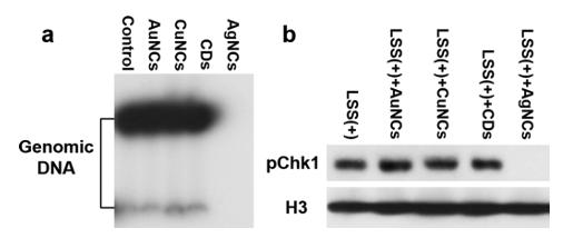 Figure S4. (a) Replicating extracts were incubated with gold nanoclusters (AuNCs), copper nanoclusters (CuNCs), carbon dots (CDs) and silver nanoclusters (AgNCs) for 90 minutes, and DNA replication was assessed by incorporation of α-[32P]dCTP into genomic DNA. (b) The impact of AuNCs, CuNCs, CDs and AgNCs on DNA replication checkpoint was monitored by pChk1 Western blotting. |