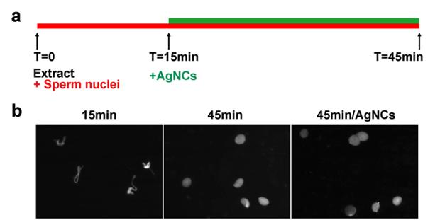 Figure S5. AgNCs does not inhibit nuclear assembly. (a) Schematic representation of the experiments. (b) Nuclear assembly in Xenopus egg extracts in the presence of AgNCs. Nuclear formation was followed over the course of 45 min by fluorescence microscopy with DAPI. |