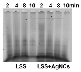 Figure S6. Micrococcal nuclease digestion of chromatin fractions in assembled in LSS extracts in the presence of AgNCs. Chromomal DNA was purified after nuclease digestion for the indicated times and separated by 1.5% TBE-agarose gel electrophoresis. |