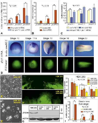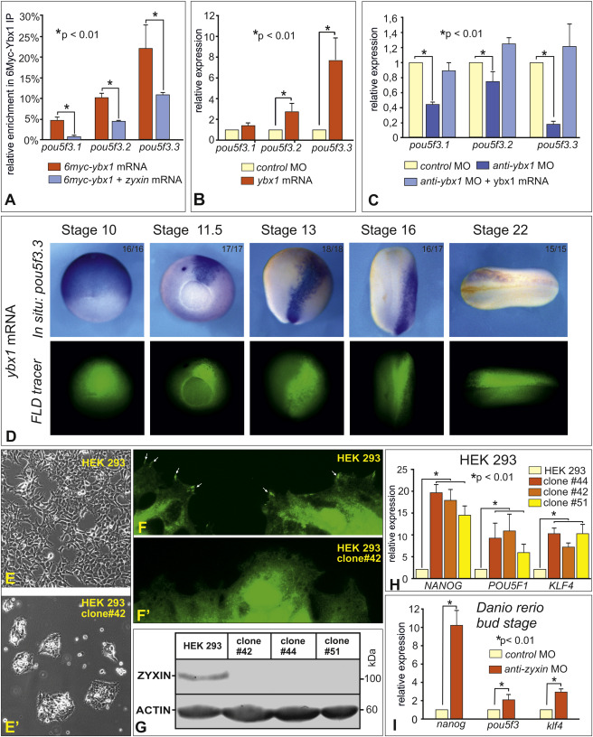 Figure 3. Regulation of pou5f3 Transcript Levels in X. laevis Embryos by Ybx1 and KLF4 and NANOG Transcript Levels in D. rerio Embryos and Human HEK293 Cells by Zyxin