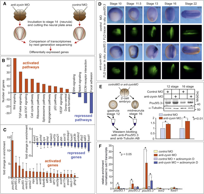 (E) zyxin downregulation increases endogenous Pou5f3.3 protein levels. Left: scheme of the experiment. Right: western blot with anti-Pou5f3.3 antibodies. Lower right: statistical analysis of the data. ∗p < 0.01, Student’s t test.