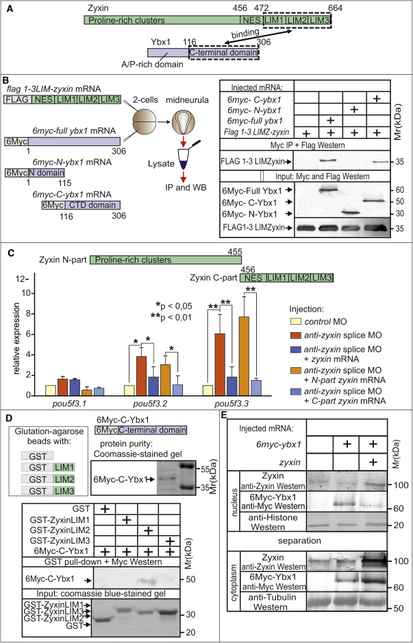 (B) IP assay for LIM domains of zyxin binding to the full and CTD domain of Ybx1 in extracts of Xenopus embryos injected with the corresponding mRNAs. Left: schematic of the constructs. Right: results of co-IP.
