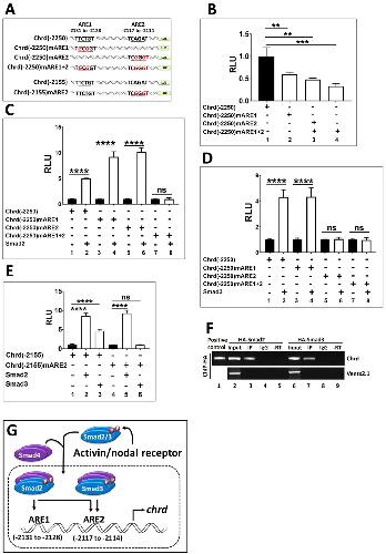 Fig. 4. Chrd promoter contains ARE1 and ARE2. (A) Systemic representation of mutated ARE1 and ARE2 (underlined, italic, red color) within the region of â2250 bps to â2155 bps selected in chrd promoter construct. (B) Relative luciferase activity for chrd(-2250) chrd(-2250)mARE1, chrd(-2250)mARE2, and doubly-mutated chrd(-2250)mARE1+2. (C and D) Relative luciferase activity assay for chrd(-2250) chrd(-2250)mARE1, chrd(-2250)mARE2, and doubly-mutated chrd(-2250)mARE1+2 with or without Smad2 or Smad3. (E) Relative reporter activity of chrd(-2155) and chrd(-2155)mARE2 with or without Smad2 or Smad3. (F) ChIP-PCR was performed with anti-HA immunoprecipitated endogenous chrd promoter using specific primers (PCR amplicon contained both ARE1 and ARE2 region). For positive control, chrd(-2250) plasmid was used as template and Ventx2.1 coding region primer serves as negative control. (G) Proposed model for Smad2/3 mediated regulation of chrd transcription. (For interpretation of the references to color in this figure legend, the reader is referred to the Web version of this article.)