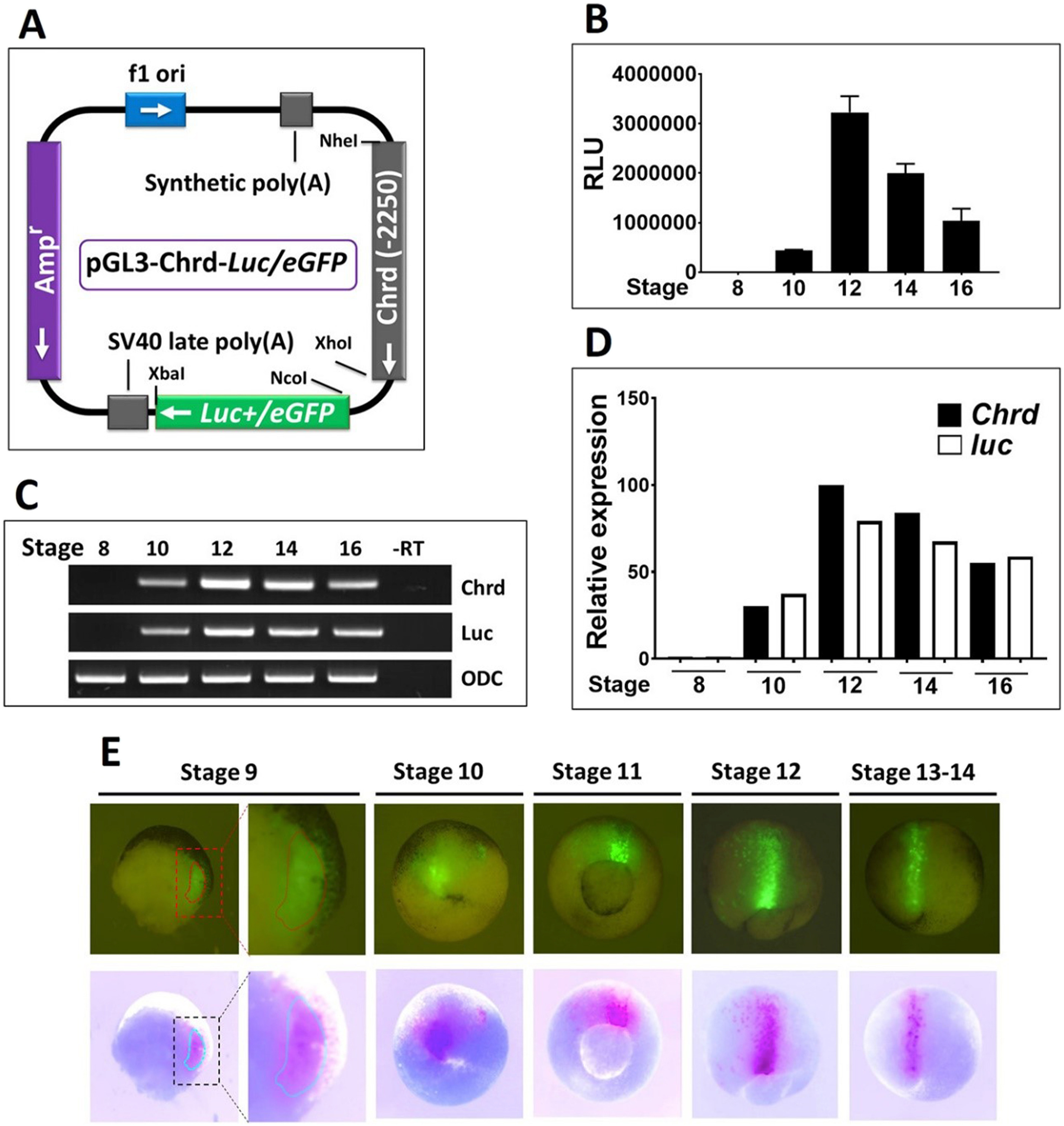 Fig. 1. Analysis of chrd(-2250)luc/eGFP expression in a stage-dependent manner. chrd(-2250)luc (40 pg/embryo) and chrd(-2250)eGFP (200 pg/embryo) were injected at one-cell stage. (A) Map of cloned chrd(-2250)luc/eGFP constructs in the pGL3 basic plasmid. (B) Stage-wise reporter gene activity assay using pGL3(-2250)luc. (C) mRNA expression patterns of endogenous chrd, and cloned chrd(-2250)luc promoter in a stage-dependent manner. (D) Quantification of mRNA levels of endogenous chrd and ectopic expressed chrd(-2250)luc (normalized to ODC) in independent experiments run in (C). (E) eGFP fluorescent was analyzed at stage 9 in bisected Xenopus embryos (expressed in dorsal hemisphere) and also stage 10, stage 11, stage 12, and stage 13â14. Upper panel shows original fluorescent expression while lower panel includes the inverted color images of focused eGFP expression (pink color). -RT (No RT) served as a negative control. (For interpretation of the references to color in this figure legend, the reader is referred to the Web version of this article.)