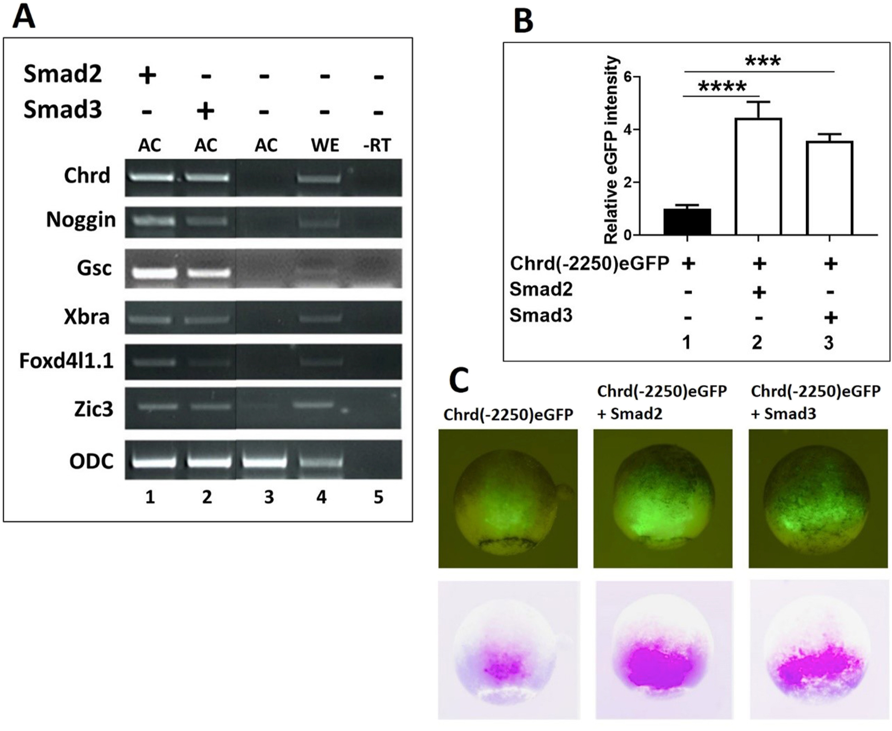 Fig. 2. Ectopic expression of Smad2 and Smad3 induced dorsal/organizer, mesoderm, and neural gene expression during gastrulae. Xenopus embryos were injected with Smad2 and Smad3 (1 ng/embryo) at one-cell stage. Animal caps (AC) were dissected at stage 8 and RT expression were analyzed at stage 11 in AC and for whole embryos (WE). (A) RT expression of different germ layer specific markers were analyzed. (B and C) The chrd(-2250)eGFP were injected with or without Smad2 and Smad3 at one-cell stage, eGFP fluorescent analysis was performed at stage 11. (B) Quantification of chrd(-2250)eGFP fluorescent intensity (bar 1) co-injected with Smad2 (bar 2) and co-injected with Smad3 (bar 3). (C) chrd(-2250)eGFP fluorescent for co-injection of Smad2 and Smad3 separately (at stage 10â10.5). In the lower panel, inverted color images to generate the pink color for eGFP fluorescent positive areas and reduce the background. -RT (No RT) served as a negative control and un-injected whole embryo (WE) served as positive control. Un-injected animal cap (AC) was also a control for injected animal caps. (For interpretation of the references to color in this figure legend, the reader is referred to the Web version of this article.)