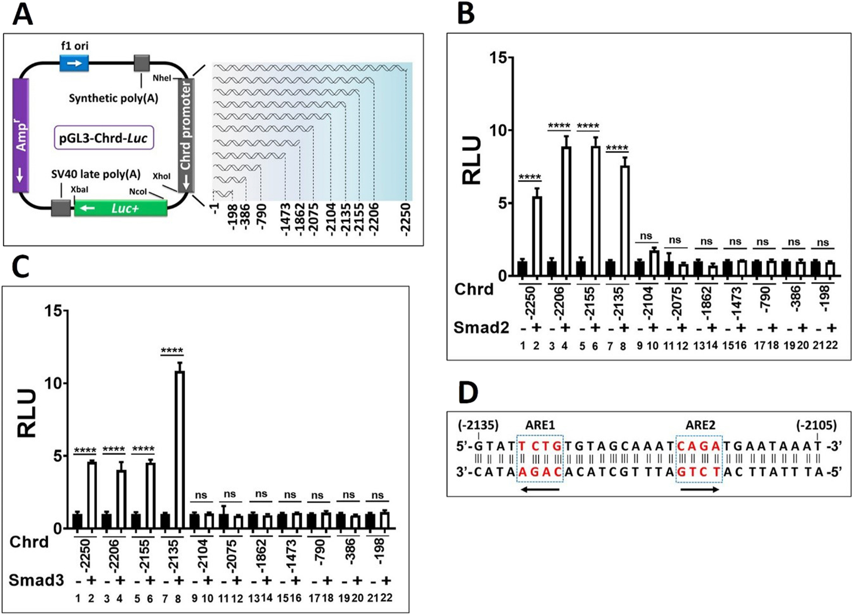 Fig. 3. chrd(-2250) promoter contained two activin/smad response elements (ARE1 and ARE2). (A) Schematic representation of the serially-deleted promoter constructs of chrd during gastrula. (B and C) Relative promoter activities of serially-deleted promoter constructs of chrd with or without Smad2 (B) and Smad3 (C). (D) Marked ARE1 and ARE2 (red color with blue-dotted boxes) within the promoter regions from â2135 bps to â2105 bps upstream of chrd TSS. Arrows indicate the putative directions for the AREs located in chrd promoter within the â2135 bps to â2105 bps marked in blue-dotted boxes. (For interpretation of the references to color in this figure legend, the reader is referred to the Web version of this article.)