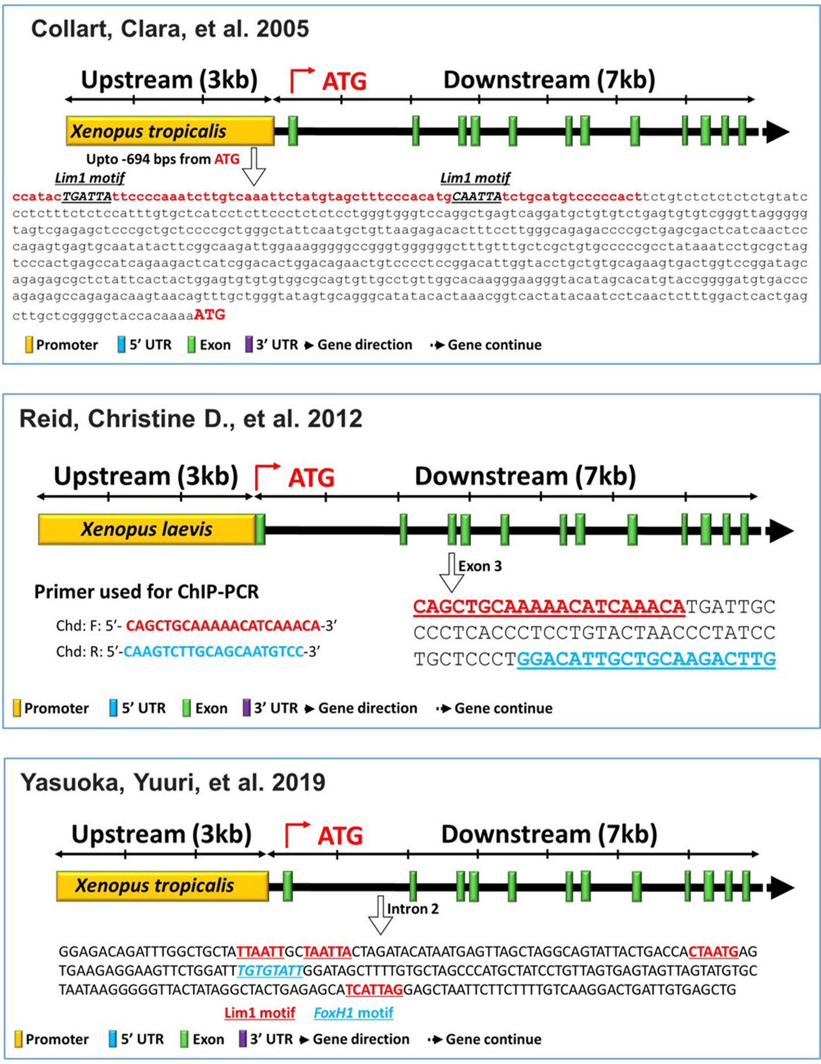 Transforming growth factor (TGF)β/activin superfamily regulates diverse biological processes including germ layer specification and axis patterning in vertebrates. TGFβ/activin leads to phosphorylation of Smad2 and Smad3, followed by regulation of their target genes. Activin treatment also induces the essential organizer gene chordin (chrd). The involvement of Smad2/3 in chrd expression has been unclear as to whether Smad2/3 involvement is direct or indirect and whether any cis-acting response elements for Smad2/3 are present in the proximal or distal regions of its promoter. In the present study, we isolated the -2250 bps portion of the chrd promoter, showing that it contained Smad2/3 direct binding sites at its distal portion, separate from the proximal locations of other organizer genes, goosecoid and cerberus. The pattern of transcription activation for the promoter (-2250 bps) was indistinguishable from that of the endogenous chrd in gastrula Xenopus embryos. Reporter gene assays and site-directed mutagenesis analysis of the chrd promoter mapped two active activin/Smad response elements (ARE1 and ARE2) for Smad2 and Smad3. For a differential chrd induction, Smad2 acted on both ARE1 and ARE2, but Smad3 was only active for ARE2. Collectively, the results demonstrate that the distal region of chrd promoter contains the direct binding cis-acting elements for Smad2 and Smad3, which differentially modulate chrd transcription in gastrula Xenopus embryos.