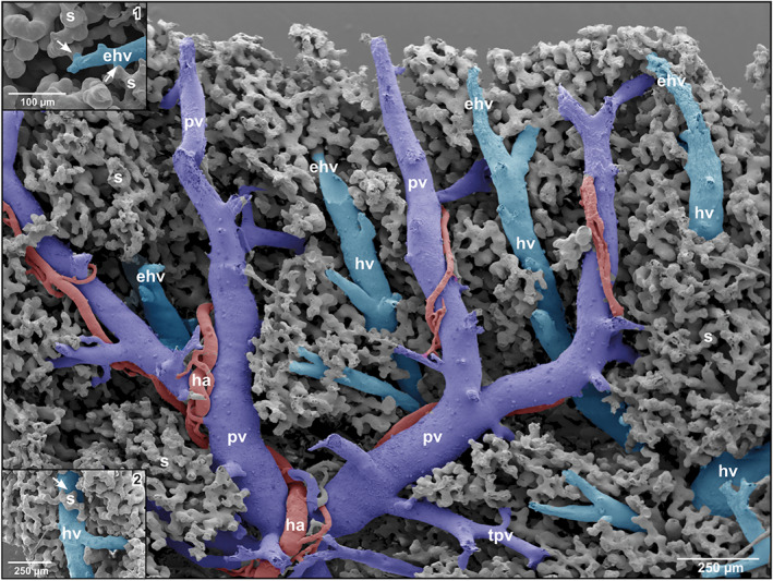 FIGURE 2. Spatial arrangement and relations of hepatic portal vein branches (pv), terminal portal venules (tpv), efferent hepatic venules (ehv), hepatic venules (hv) and hepatic arteries/arterioles (ha). Note that parallel running portal vein branches (pv) and branches of the efferent hepatic veins (ehv) are closely spaced. Inset 1 Transitions of sinusoids (s) into an efferent hepatic venule (ehv). Note the tube‐like outlet portions of sinusoids (s) (arrows). Inset 2 Sinusoid (s) draining into a larger hepatic venule (hv)(arrow)