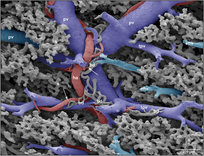 FIGURE 3. Microvascular anatomy of a portal triad consisting of portal vein (pv), hepatic artery (ha) and bile duct (bd). Note the peribiliary plexuses ensheathing fragments of small bile ducts