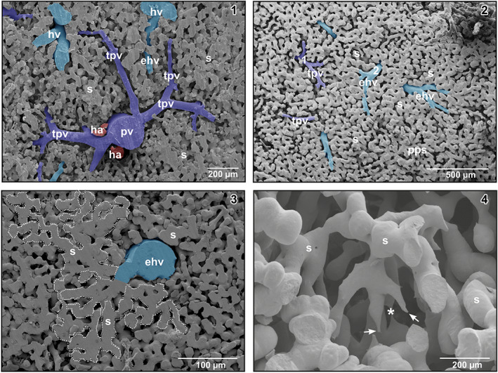 FIGURE 4. (1) Spruce tree‐like branching pattern of a portal venule (pv). Detail from a transverse sectioned specimen. Note an efferent hepatic venule (ehv) between terminal portal venules (tpv). (2) Vascular pattern of the parieto‐pleural surface of the liver. Note terminal portal venules (tpv, 1) and efferent hepatic venules (ehv, 2). (3) Territory of interconnected sinusoids (encircled area) which drains into an efferent hepatic venule (ehv). (4) Three‐dimensional network of sinusoids (s) displaying blind ending tapered vascular structures (arrows) as signs of ongoing sprouting angiogenesis. Note the close by thin sinusoid (asterisk)