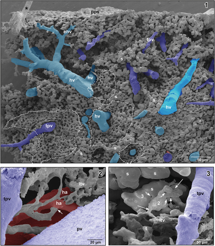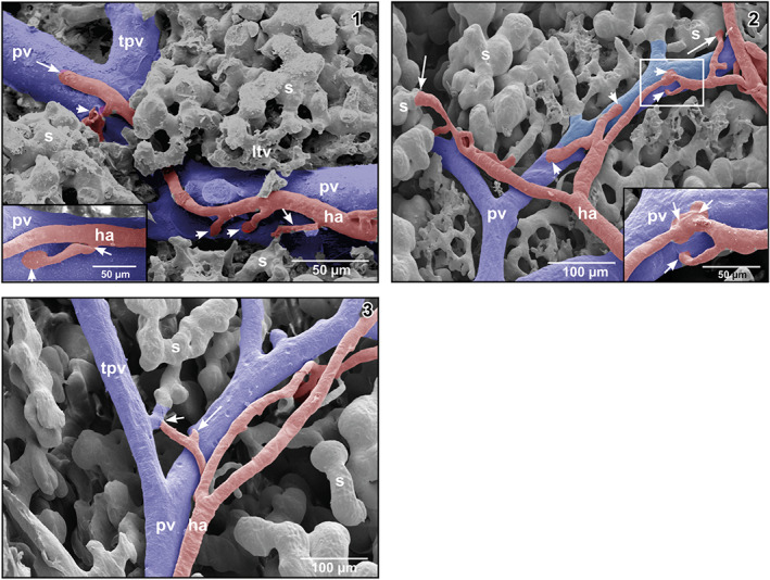 FIGURE 7. (1) Honeycomb‐like microvascular meshwork around hepatic venules (hv) and terminal portal venule (tpv) (encircled areas). Asterisk marks “conductive bridge.” (2) Arterial supply of the lymphoid tissue vasculature (arrow). (3) Gradual transition (1–3) of the lymphoid tissue vasculature into sinusoids (s) (large arrows). Note the “holes” indicating non‐sprouting angiogenesis (small arrows)