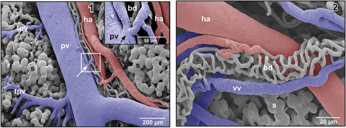 FIGURE 6. (1) Microvascular anatomy of a small subcapsular bile duct (bd) located between portal venule (pv) and hepatic arteriole (ha). The peribiliary vascular plexus drains into the portal venule (arrow). Inset Detail (framed area). Note the shallow circular imprint at the inlet site of the efferent peribiliary venules into the portal venule (pv). (2) Microvascular anatomy of a peribiliary vascular plexus of an extraparenchymal bile duct (bd)