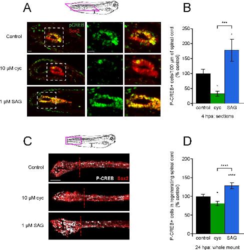 Figure 7. Post-amputation activation of CREB is regulated by Hedgehog (Hh) signaling.Stage 39–40 larvae were amputated in vehicle (0.1% DMSO, control), 10 µM cyclopamine, or 1 µM SAG, then fixed at either 4 or 24 h post amputation (hpa) and processed for immunostaining in either paraffin sections (A, B), or whole-mounts (C, D), respectively. (A) Representative longitudinal sections from 4 hpa. Sample orientation displayed in schematic. Scale bars, 20 µm. (B) Graph shows mean ± SEM P-CREB+ cell count in 100-µm-long spinal cord within 400 µm of the amputation plane as % of control, n of larvae ≥5 per group from N = 3 independent experiments. (C) Representative whole-mount sections from 24 hpa. Sample orientation displayed in schematic. Scale bar, 50 µm. (D) Graph shows mean ± SEM P-CREB+ cell count in the regenerated spinal cord, normalized to cohort matched controls, n of larvae ≥12 per group from N = 3 separate experiments. In (B, D), *p<0.05, ***p<0.001, ****p<0.0001, one-way ANOVA + Holm–Sidak’s multiple comparison.Figure 7—source data 1. Post-amputation activation of CREB is regulated by Hedgehog(Hh)signaling upon injury.Figure 7—source data 2. Post-amputation activation of CREB is regulated by Hedgehog(Hh)signaling in the regenerating spinal cord. |